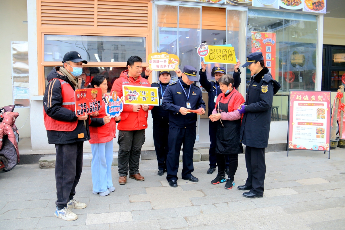 在118社区,城管队员联合社区志愿者共同走访临街商户。一家超市门口原本放着促销音箱,店主陈老板看到城管队员走近,不等开口就主动关掉了音响。“你们这个活动我早上就听社区说了,咱们街坊邻居的,安静点做生意其实也好,反而老顾客更愿意多聊两句。”他接过“静享消费”的绿色贴纸,认真贴在收银台旁。