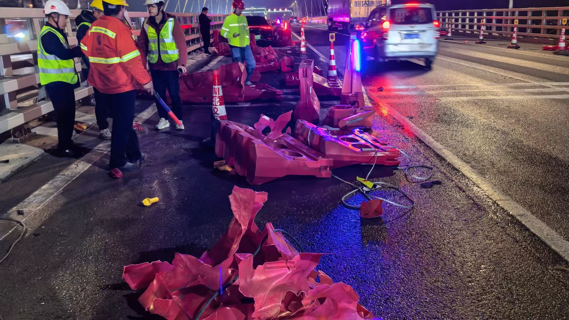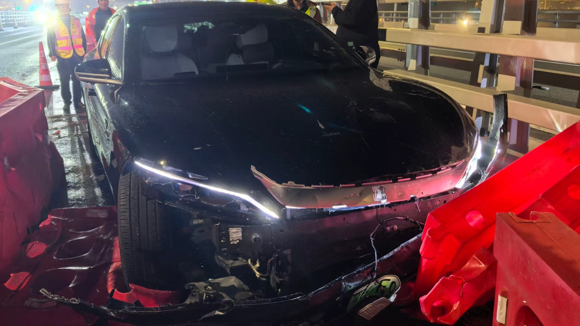 3月5日晚8时45分许,在武汉绕城高速军山大桥段,一辆新能源汽车一头扎进超车的施工区域,接连撞了近30米长的水马,直到撞倒施工区内的方向指示牌才停下。所幸车上人员都系了安全带,无人受伤,仅车辆和施工设施受损。