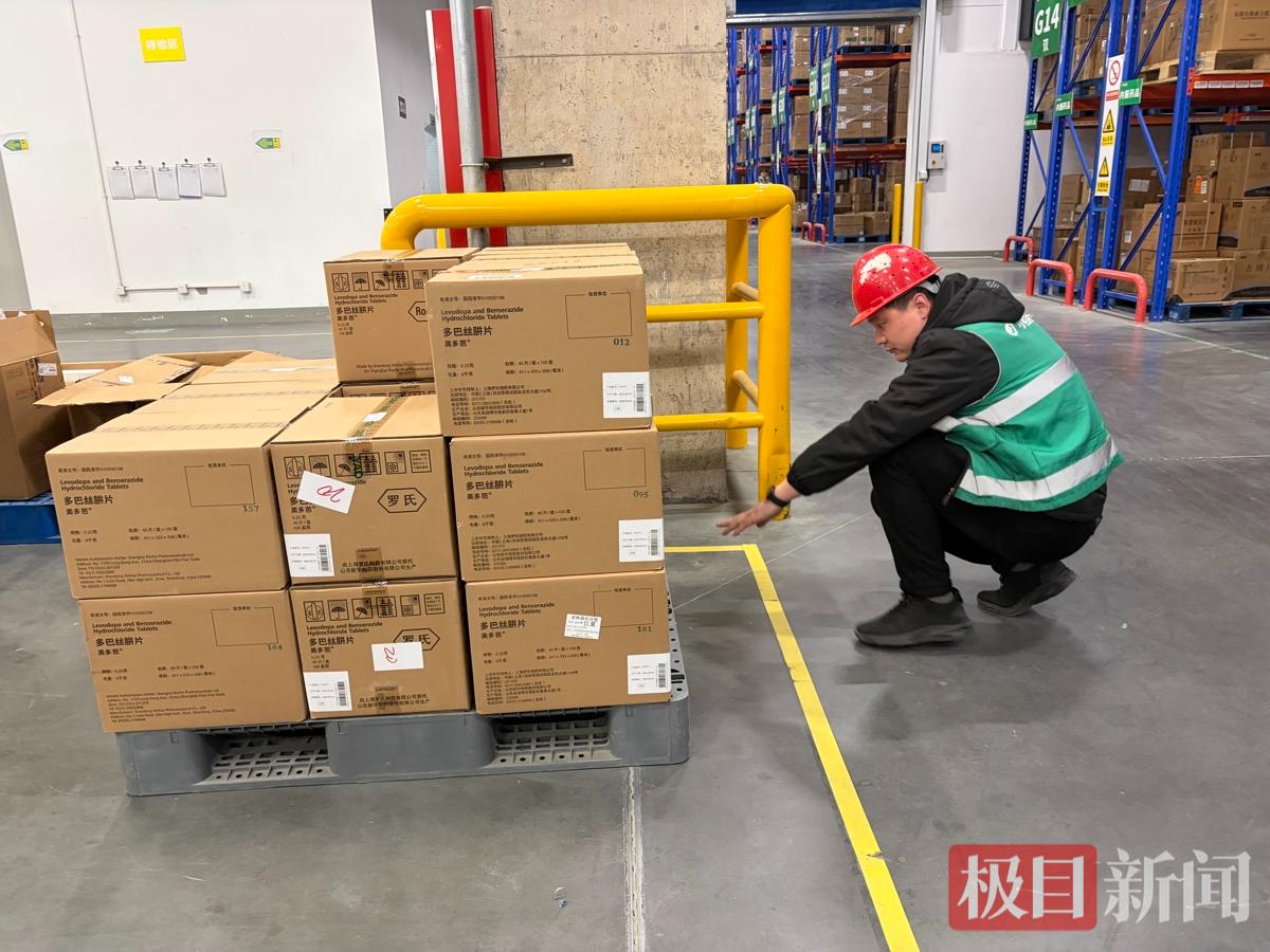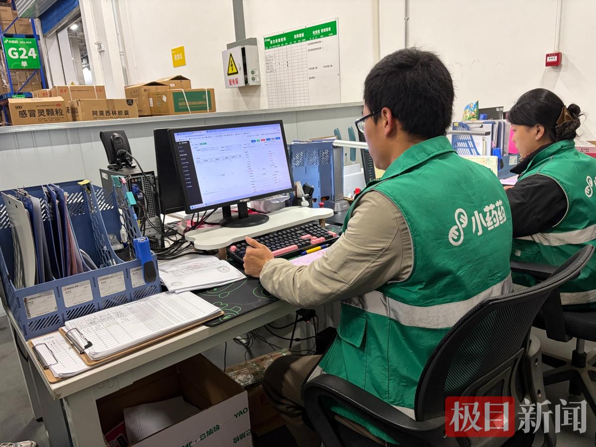 武汉小药药医药科技有限公司质管部负责人陈华向新闻记者介绍,每盒药品都有专属的追溯码,这是药品的“电子身份证”,具有唯一性。当这批藿香正气液录入系统后,仓库工作人员根据系统提示进行打包,放入系统推荐的仓库位置。