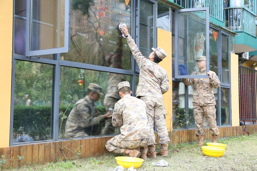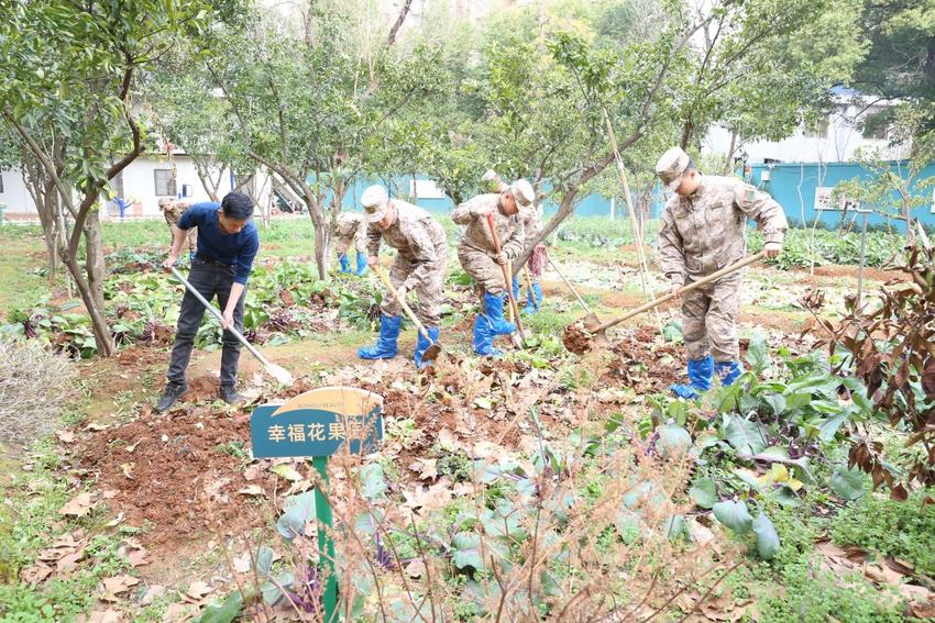 在文艺演出的同时,贴心的生活服务也在同步进行。来自陆军工程大学军械士官学校的官兵们分组行动,一部分拿起扫帚、抹布,认真细致地打扫公共区域卫生,擦拭门窗玻璃,清理卫生死角,为老人们营造更加整洁舒适的居住环境;另一部分则来到中心后院的“爱心菜园”,挥锹铲土,翻整土地,为即将开始的春种做好准备。官兵们干劲十足,汗水浸湿了衣背,但脸上洋溢着服务他人带来的满足感。