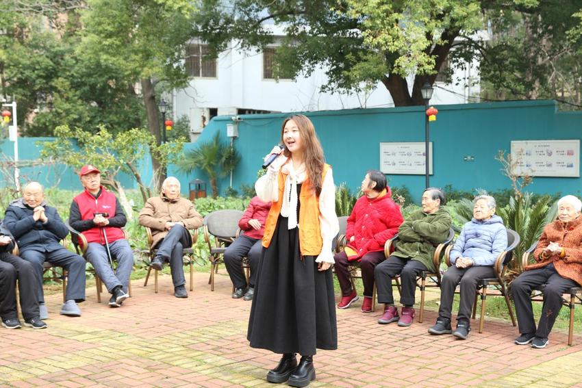 活动当天,阳光明媚,春风和煦。狮子山街综合养老服务中心内洋溢着欢声笑语。在养老服务中心的小广场上,一曲由华中师范大学音乐学院学生志愿者带来的《多情的土地》率先唱响,将对祖国的热爱与对故土的眷恋娓娓道来。一旁的爷爷奶奶竖起大拇指,连连称赞“歌声嘹亮”。随后,熟悉的《风吹麦浪》旋律响起,轻柔的曲风仿佛将金黄色的麦田带到了眼前,不少老人不自觉地跟着节奏轻轻挥动起手臂,打着节拍,脸上洋溢着陶醉的笑容。