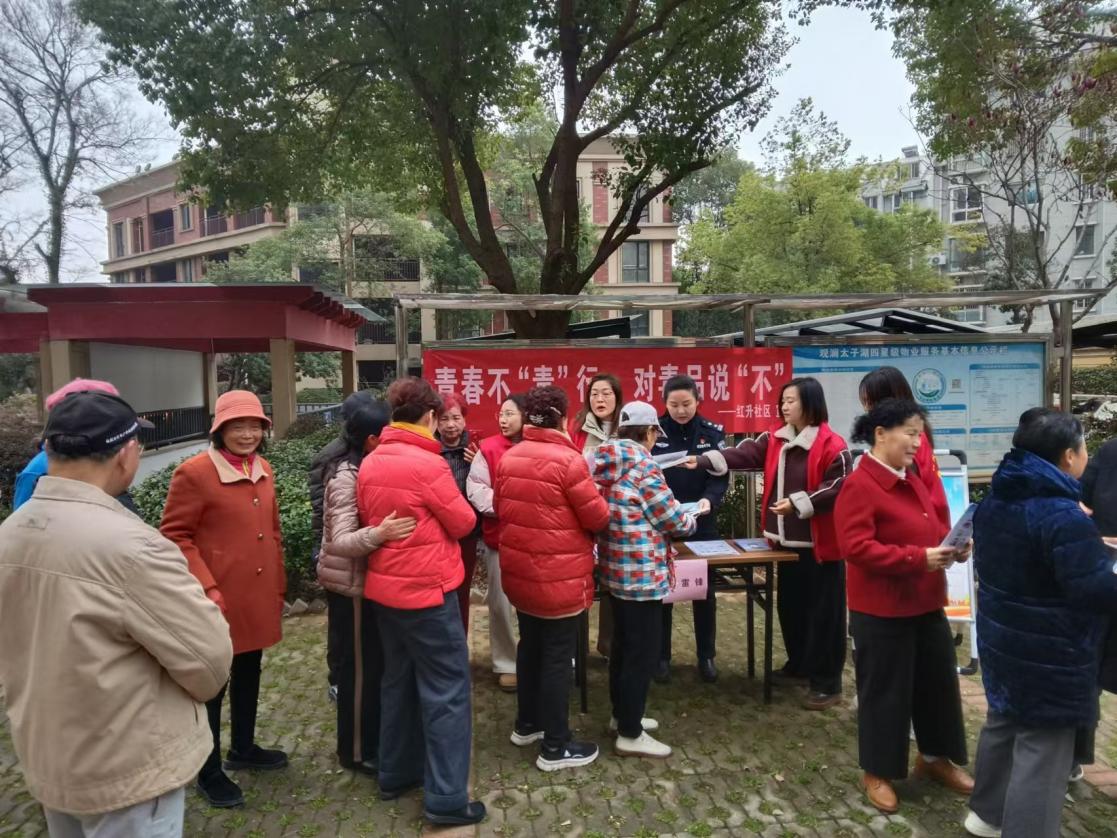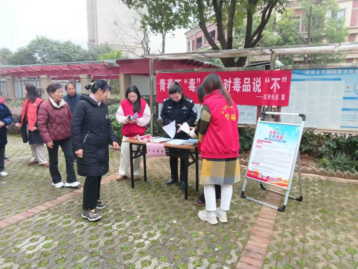为深入贯彻禁毒工作相关要求,切实筑牢社区禁毒安全防线,提升居民识毒、防毒、拒毒意识和能力,营造“人人识毒、人人防毒、人人拒毒”的浓厚社区氛围,3月5日上午,武汉经开区沌阳街道红升社区联合辖区派出所、志愿者等,在观澜太子湖小区广场开展禁毒集中宣传活动,吸引了辖区各年龄段居民积极参与。