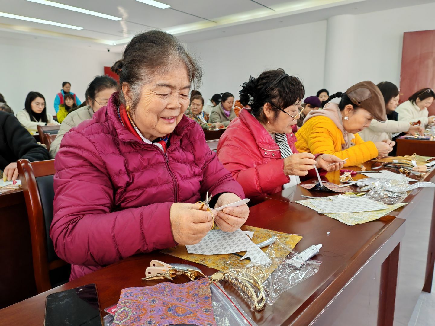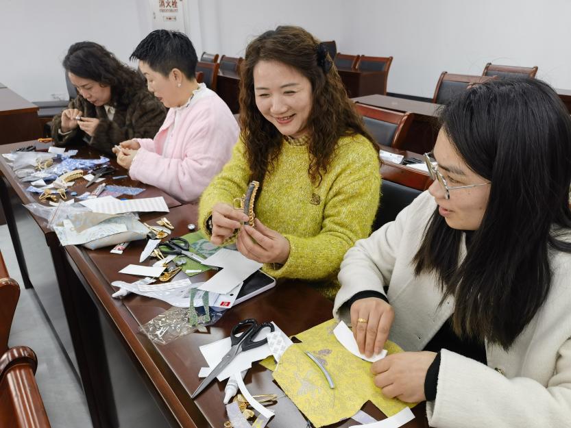 最受期待的宋锦发夹手工环节,让大家沉浸式体验指尖非遗。在社工耐心指导下,姐妹们静心裁剪、粘贴、造型,将一块块宋锦料精心制作成别致发饰。平日里忙碌于工作与家庭的她们,暂时放下琐事,专注投入手作之中。素雅温婉、灵动俏皮的宋锦发夹逐一成型,每一件作品都饱含心意,尽显巧手匠心。“平时很少有机会静下心做手工,今天既玩得开心,又学到非遗知识,还做出了漂亮发夹,特别有成就感。”一位社区女性拿着自己的作品开心分享。活动尾声,大家戴上亲手制作的宋锦发夹,互相欣赏、合影留念,灿烂笑容与绚丽宋锦相映成趣,成为这个三月最动人的风景。