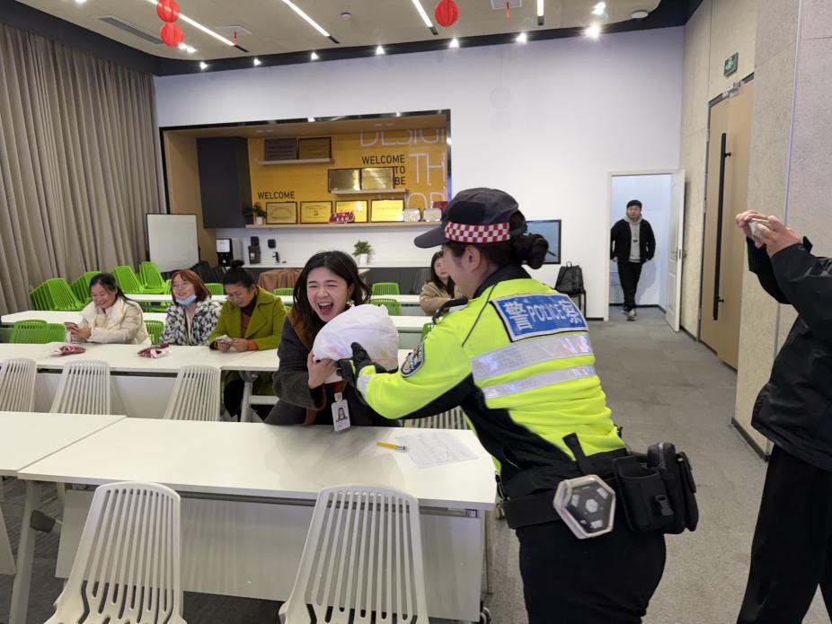 活动一开场便亮点十足,三位警花活力亮相,带来改编版交通安全唱跳《爱你》,将骑行规范、一盔一带、文明出行等知识融入轻快旋律,瞬间点燃全场气氛,新颖又亲切,让大家在轻松愉悦中记住安全知识。