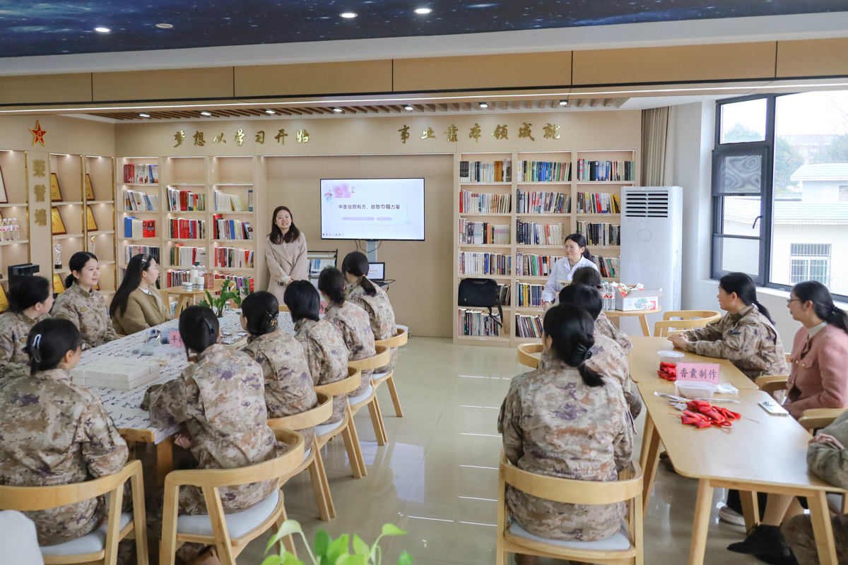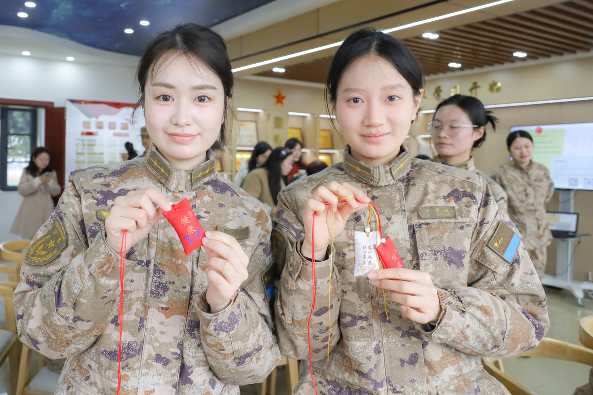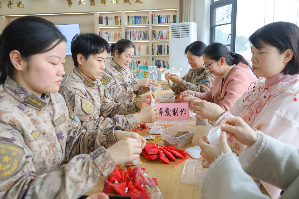 文创体验环节,军嫂们和女官兵们分为两组,分别体验无患子手串制作和中药安神香囊制作。在冯永和黄心怡老师的指导下,大家挑选材料、穿珠打结、填充药材,有条不紊地制作专属手作。无患子手串寓意平安顺遂,中药香囊承载着健康祈福,每一件作品都融入了大家的巧思与心意。制作过程中,大家相互交流、互帮互助,欢声笑语不断,在指尖流转的温情中,拉近了彼此的距离,增进了军地情谊。