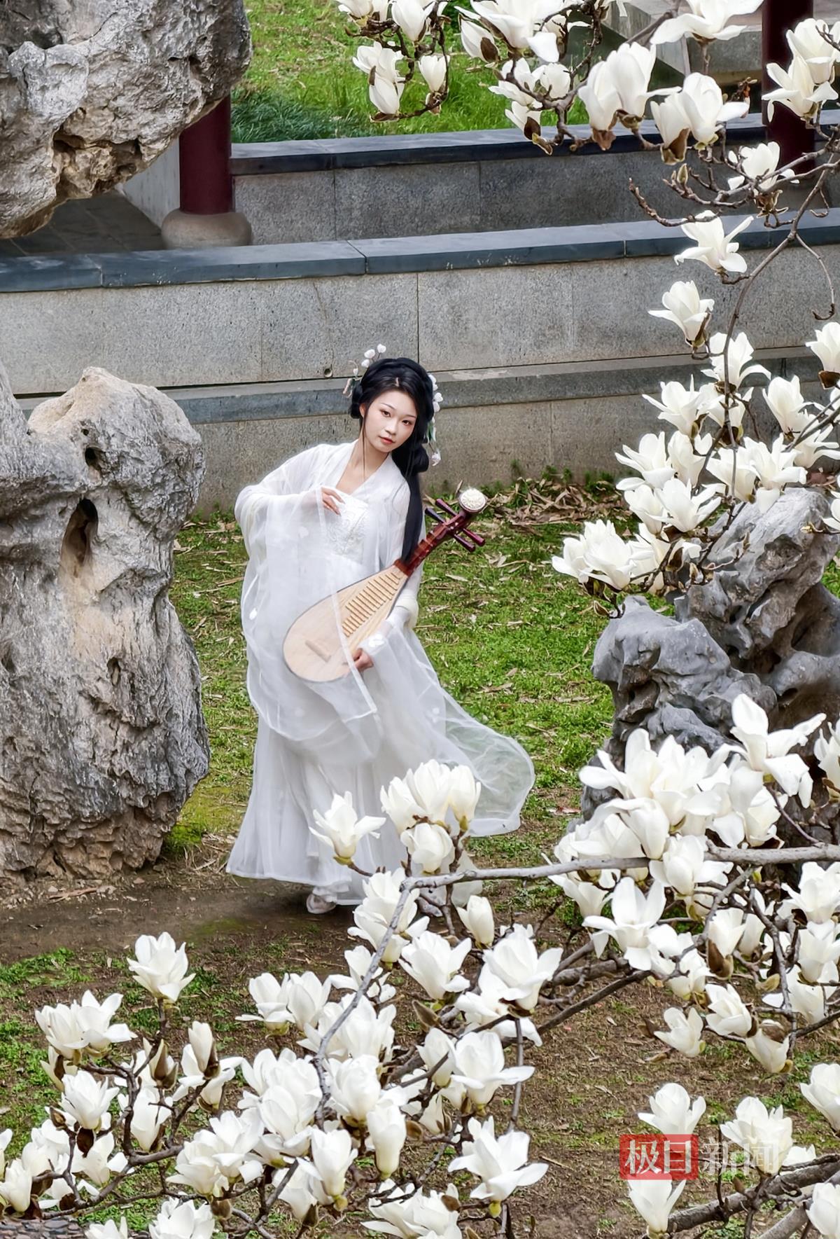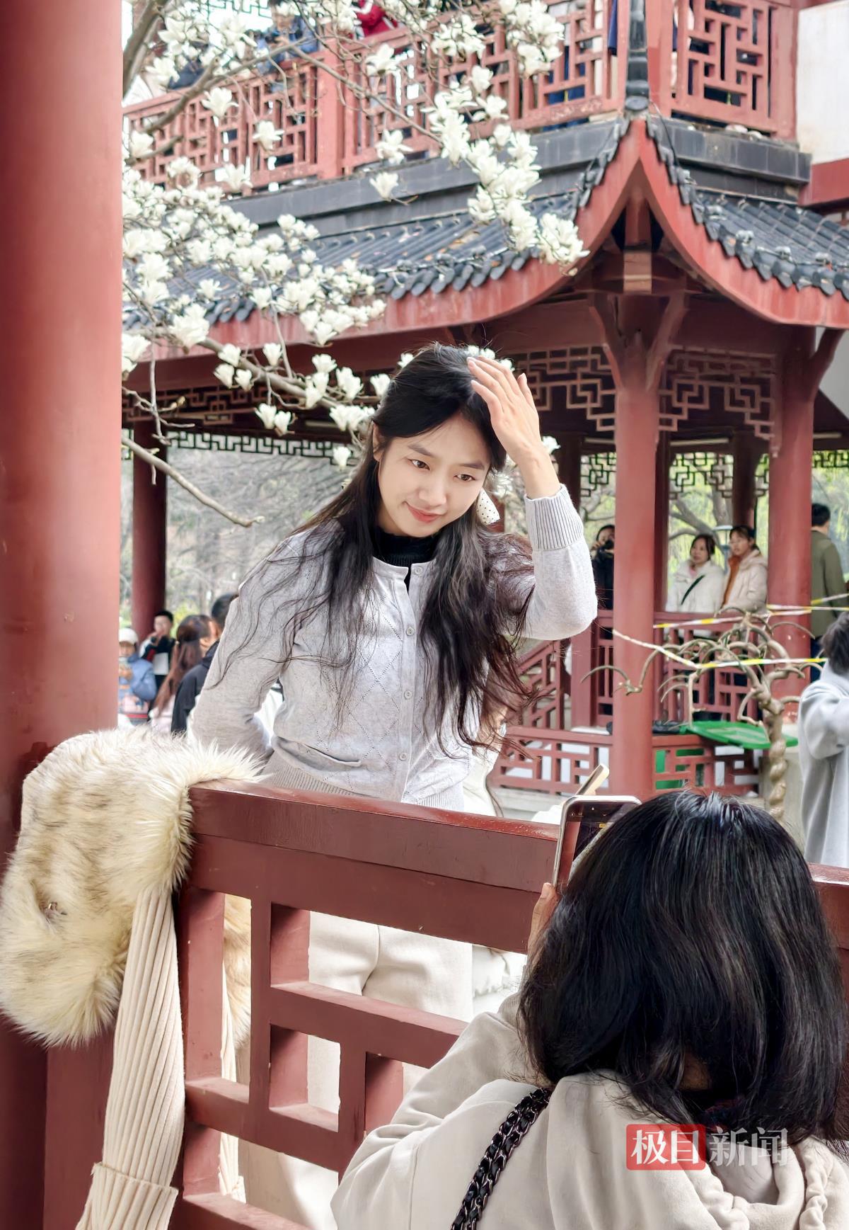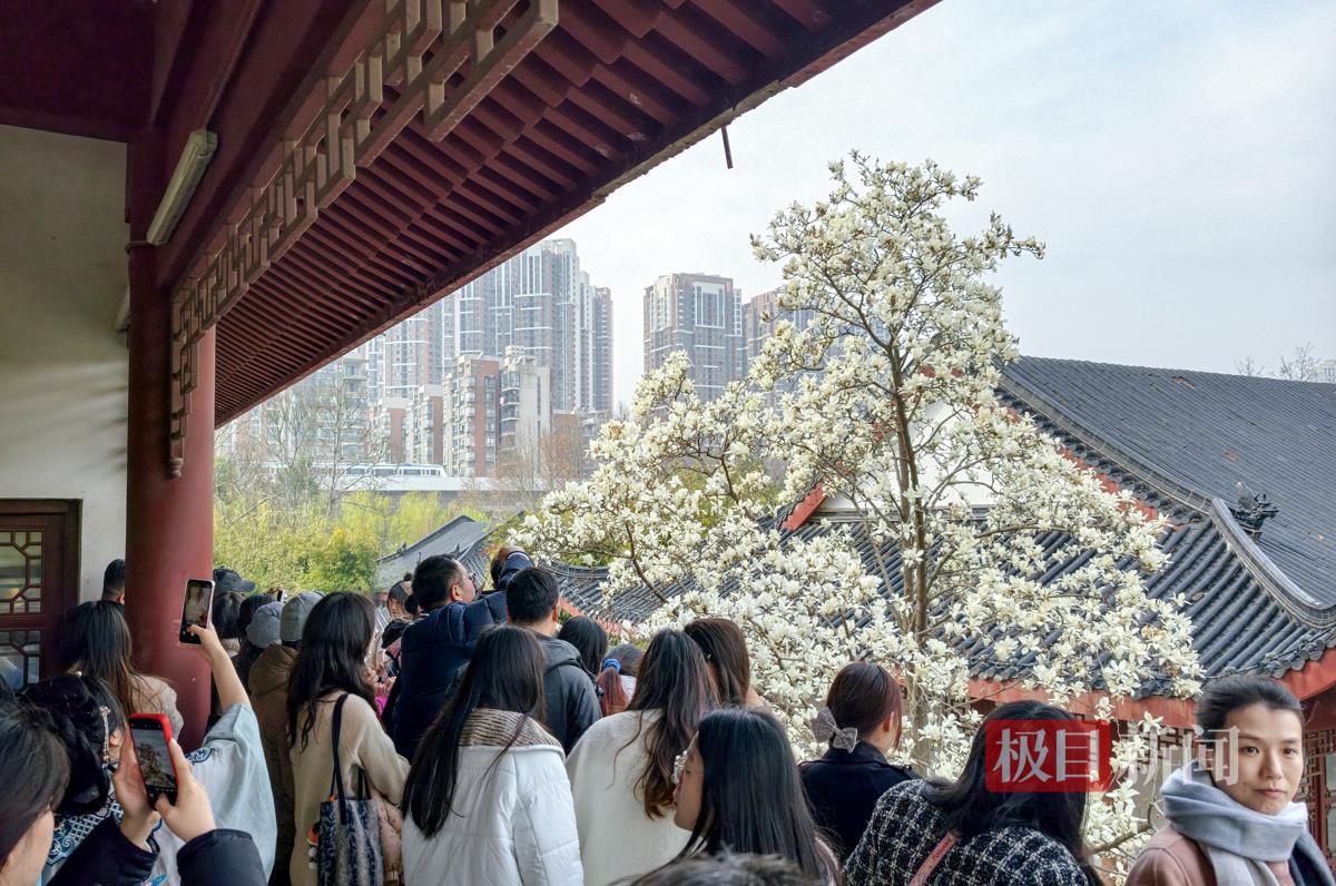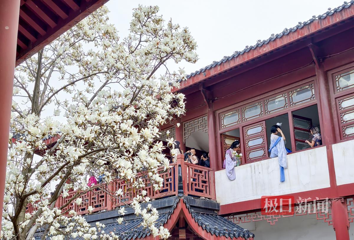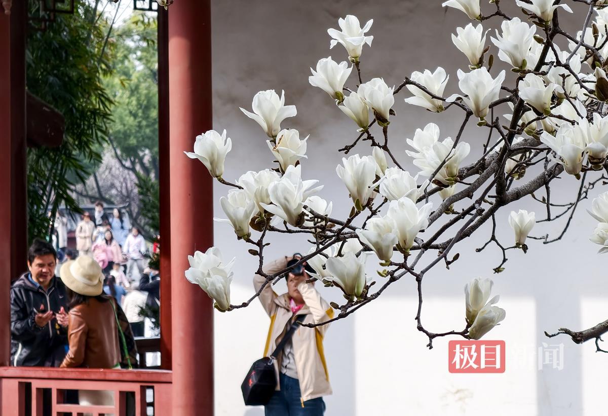 唱晚亭旁,一株白玉兰格外吸睛,洁白花朵亭亭玉立,与古色古香的亭台楼阁相映成趣,景致雅致别具韵味。这处美景成为公园热门打卡点,游客们纷纷驻足观赏,排队拍照留念,欢声笑语不断。