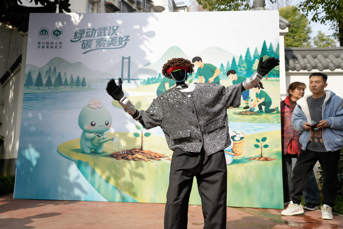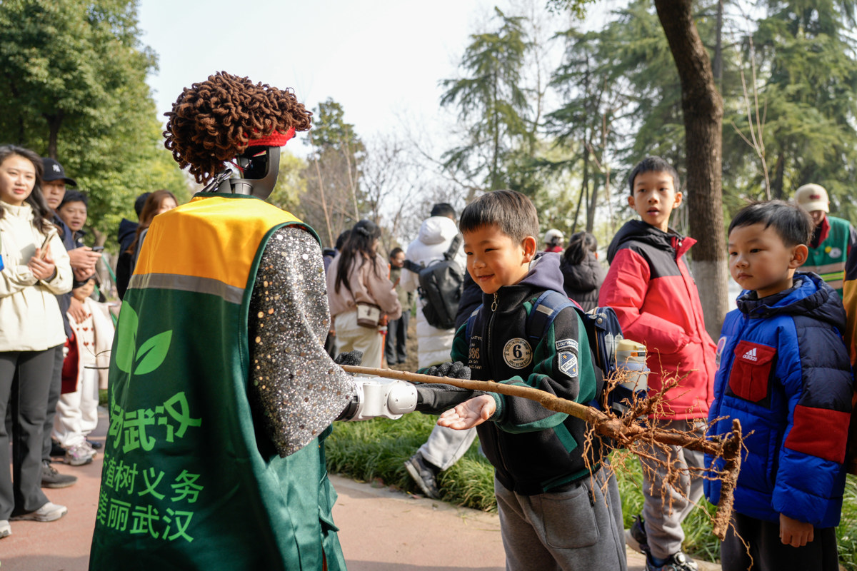 递上小树苗,讲解植树知识,武汉网红智能机器人豆皮与孩子们和市民一起,于3月7日在武昌紫阳公园植下新春新绿,引人关注。