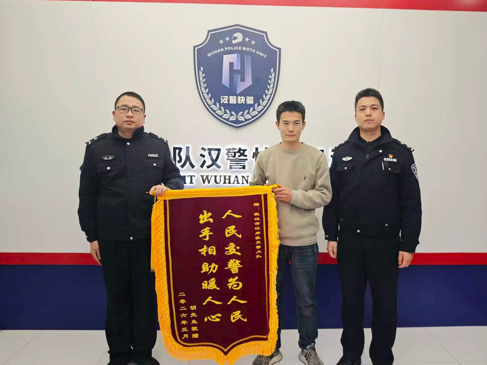 3月4日下午,患者出院后,第一时间赶到江岸区公安分局交管大队,将锦旗送到快骑队员林犇、魏恒手中,并紧紧握住队员的手反复致谢:“多亏了你们冒雨护航,我才能亲眼看到这个世界还有这么多美好,这份恩情我会永远记在心里!”