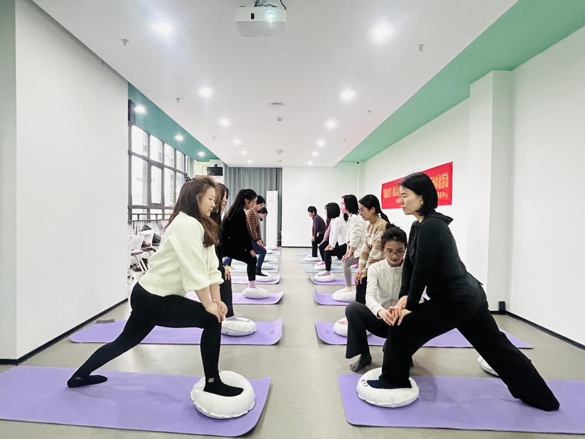 “吸气准备,呼气时配合腹式呼吸轻轻上提……”在教练细致的口令引导下,大家从最基础的腹式呼吸开始,感受核心的微微收紧。紧接着,一系列针对盆腹动力康复的专业动作循序展开:坐姿双膝内夹:借助气垫的不稳定性,激活大腿内侧与盆底肌群;臀桥运动:核心发力,缓缓抬起臀部,感受腰腹与盆底的协同;坐姿前合后开:在动态开合中增强髋关节灵活性与核心控制力;四足单腿伸展:平衡与发力并举,挑战身体稳定性;半蹲练习:配合呼吸,强化下肢力量,稳固盆底支撑。每一个动作,教练都逐一走到身边,耐心纠正姿势,确保大家练对、练到位。从最初的生疏试探到渐入佳境,姐妹们认真投入的神情,成为活动现场最美的风景。