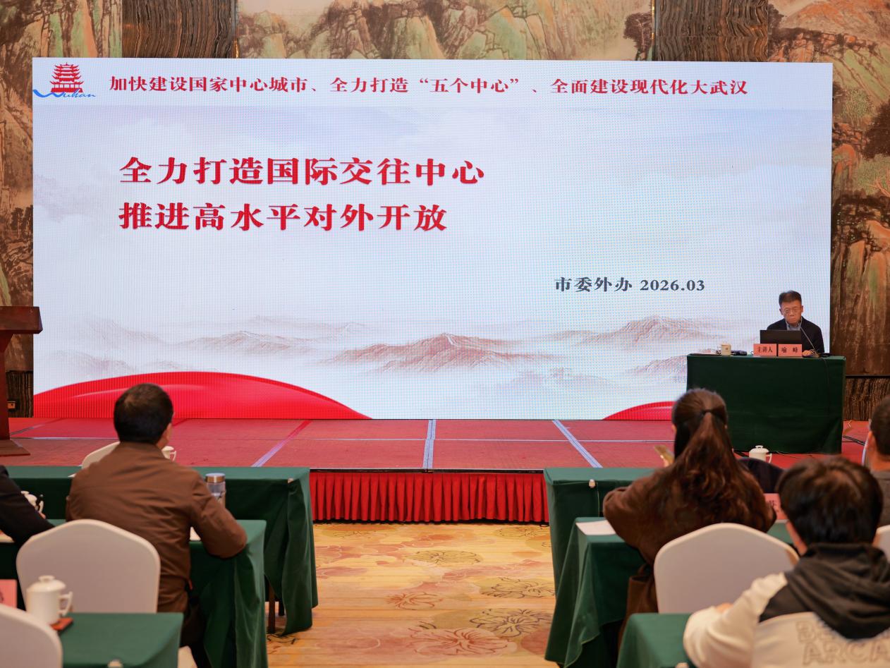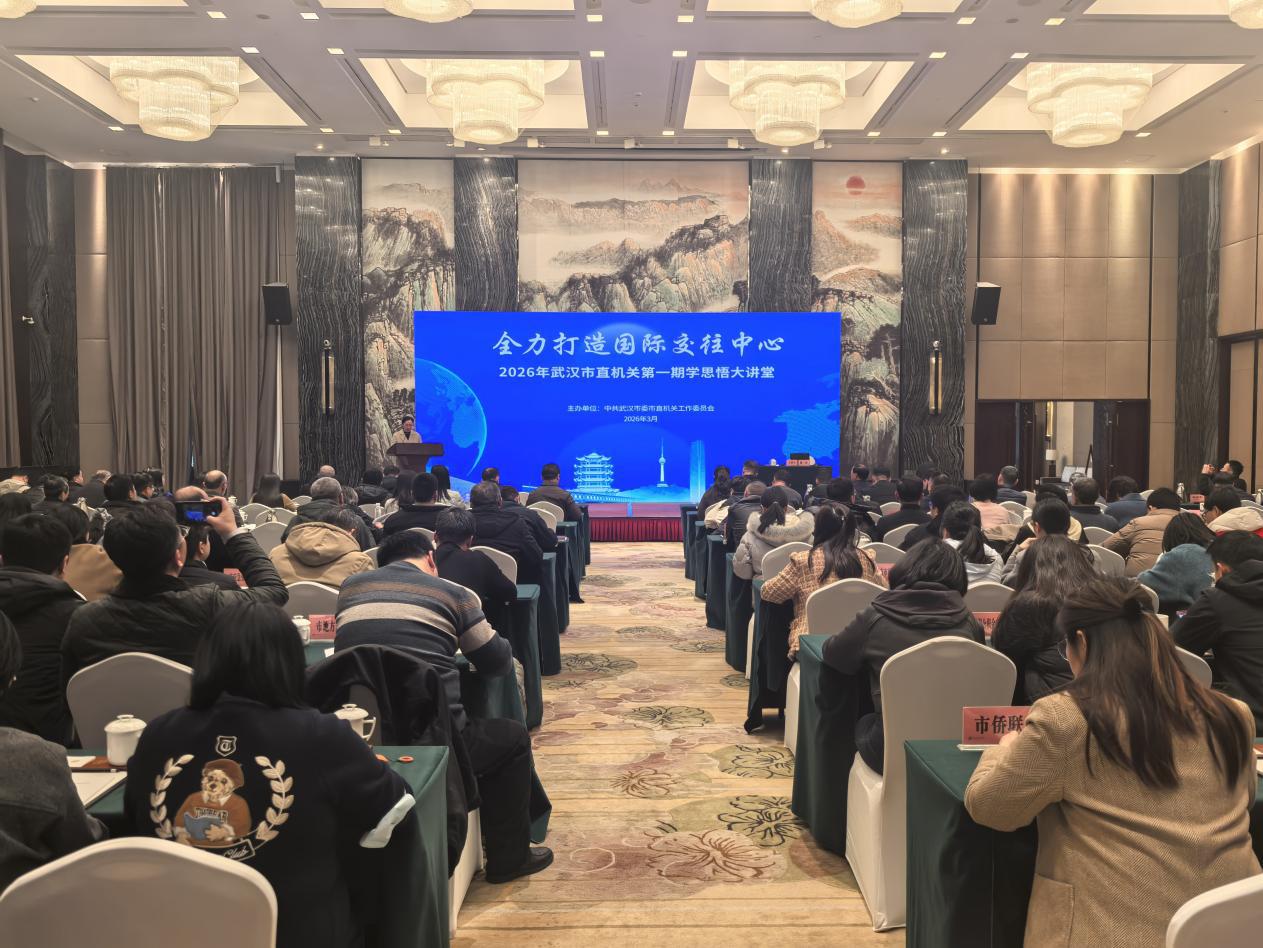 3月6日,2026年第一期武汉市直机关“学思悟”大讲堂在武汉会议中心开讲,本期讲座以“全力打造国际交往中心”为主题,武汉市委外办主任喻峰作专题辅导。