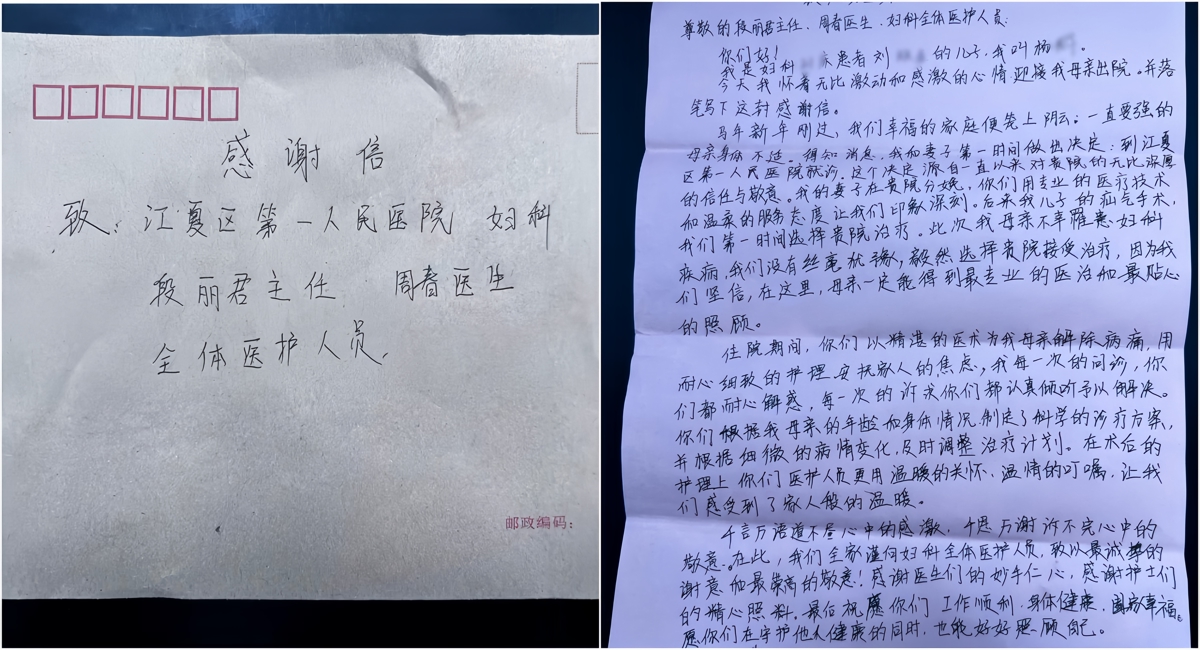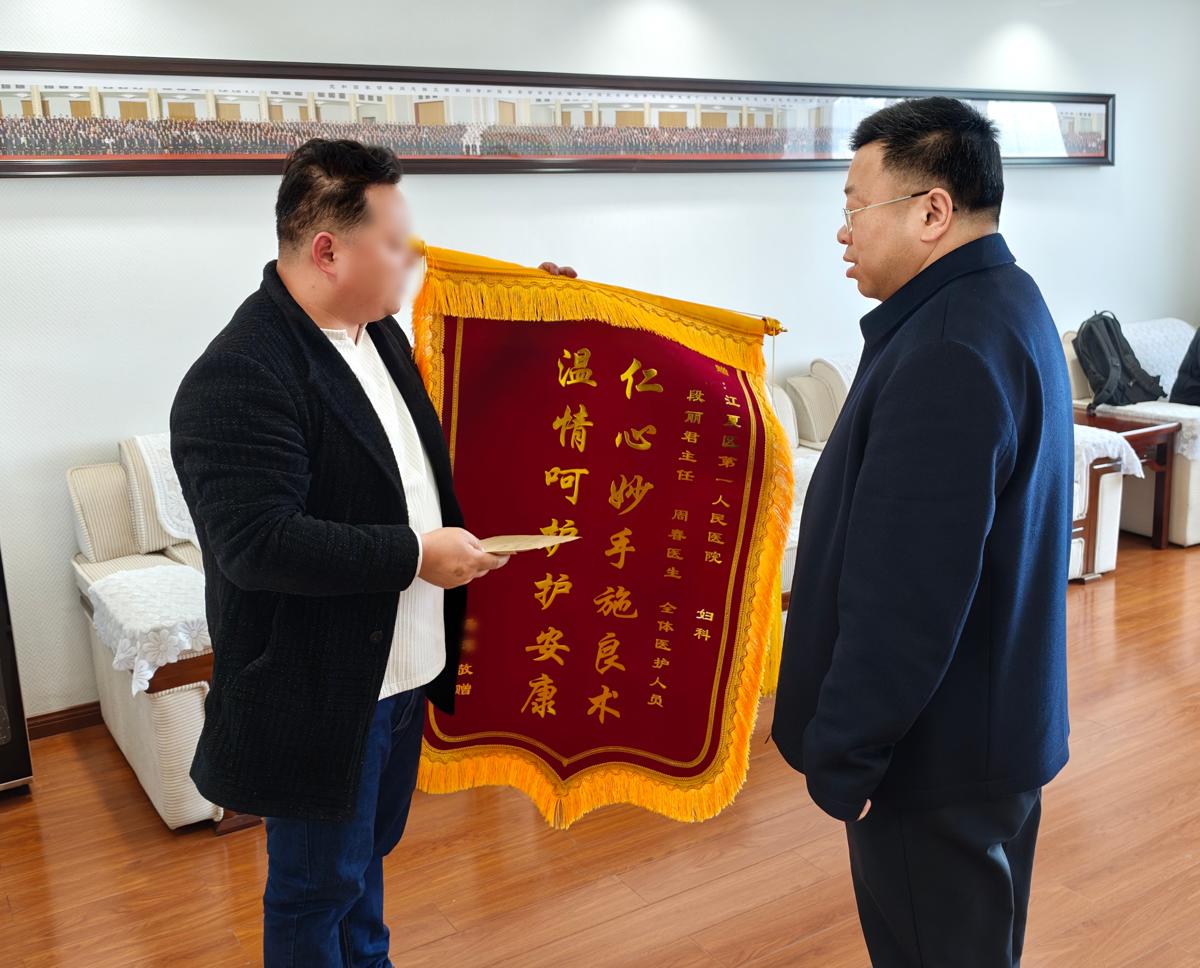 3月9日下午,来自武汉市江夏区庙山的市民杨先生专程来到江夏区第一人民医院(协和江南医院),将一面写有“仁心妙手施良术温情呵护护安康”的锦旗,一封饱含真情、记录着八年来三次关键托付的手写感谢信送到院方手中,并恳请代为转交给该院妇产科医护团队。