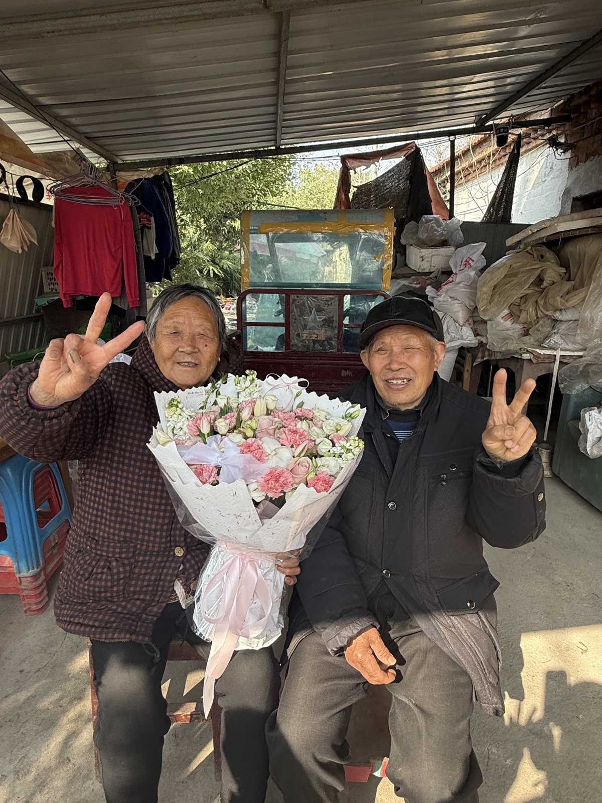 两人的大女儿朱凤英告诉记者,他们是看到同学转发的视频,才知道爸爸给妈妈买了花。“我也很羡慕妈妈。”朱凤英说,爸爸虽平时话少、内向,但一直用行动照顾着妈妈。老两口住惯了村里,只有逢年过节才愿意去孩子家住。父母是家里的主心骨,一大家子和和美美。
