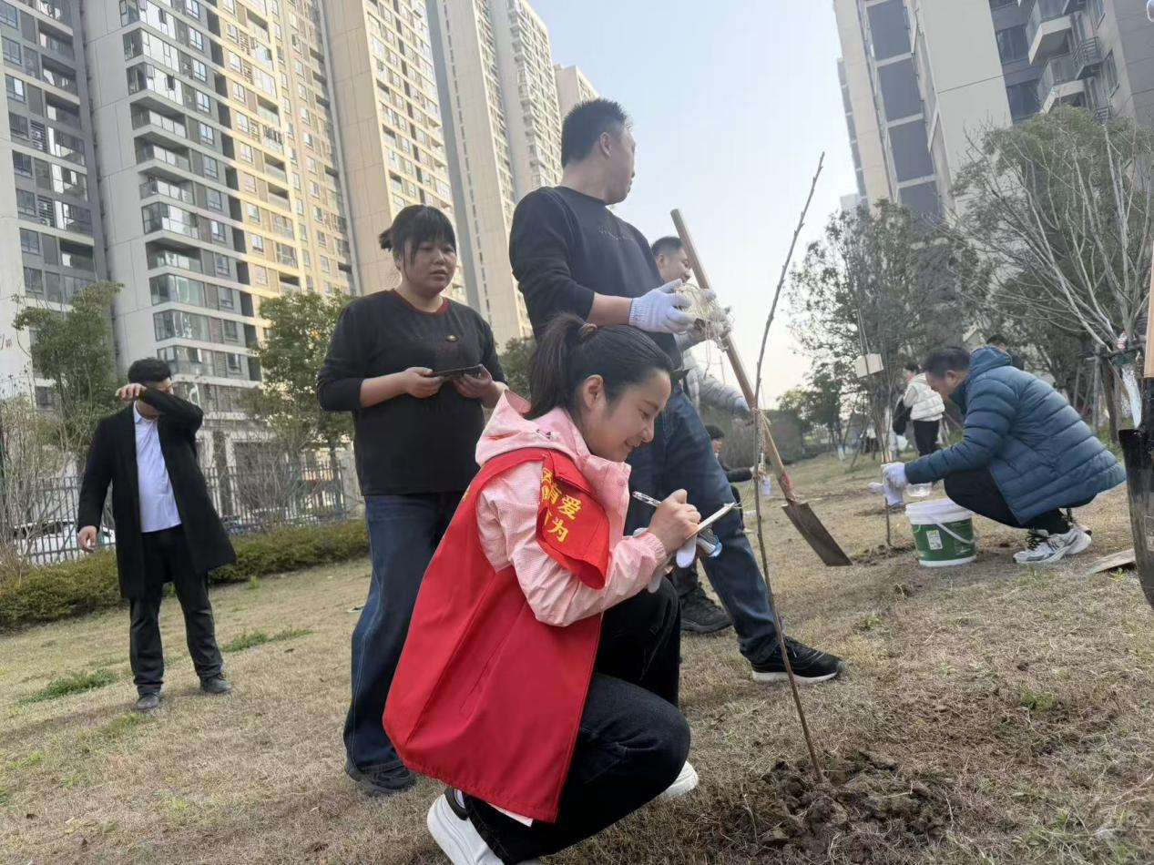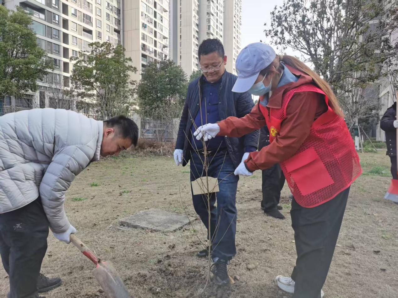 活动现场暖意融融、干劲十足,社区工作人员、物业员工、企业职工分工明确、配合默契,呈现出一派热火朝天的劳动景象。小区居民志愿者也纷纷加入了植树队伍,大家手持铁锹、锄头、水桶等工具,有条不紊地开展栽种工作:有的挥锹挖坑、整理树坑,有的小心翼翼扶苗定根,有的回填培土、踩实压紧,有的提桶浇水、滋润新苗。树苗栽种完毕后,专业绿化师傅教给志愿者们修剪枝丫和养护技巧。谌家矶物业公司工作人员及时为每棵新栽树苗挂上标识牌,清晰标注栽树人姓名与栽种日期,负责认领管护,物业安排专人定期为树苗浇水、松土,确保新苗成活率,让每一棵树苗都能得到精心照料。