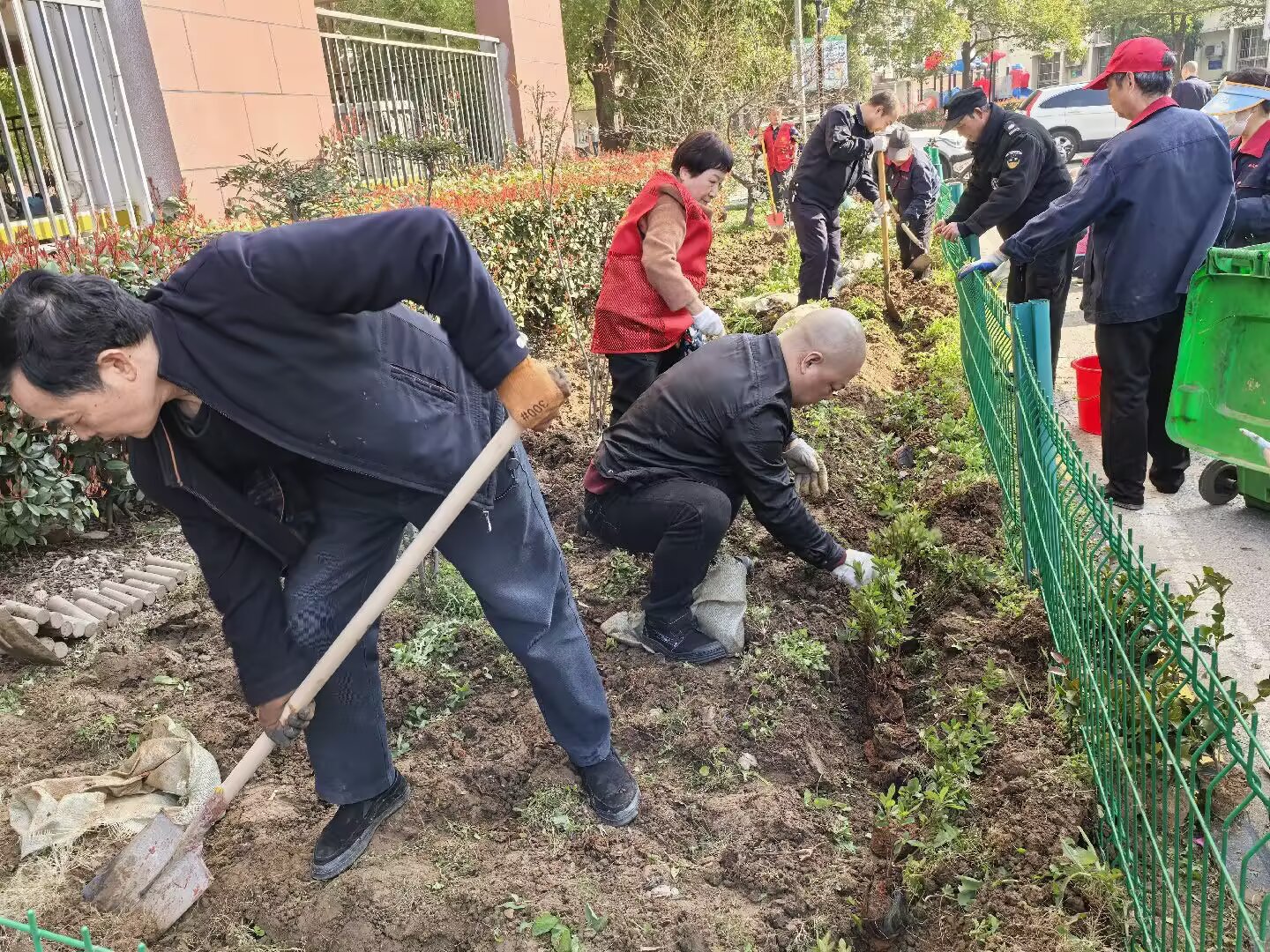 活动现场,大家分工明确、配合默契。社区党员干部带头示范,志愿者们干劲满满,物业人员专业有序,大家手持铁锹、锄头、耙子等工具,在小区五栋绿色驿站外围区域精心规划、合理栽种。大家一起扶苗、培土、压实、浇水,认真种下一株株茶梅、杜鹃等观赏花卉。新栽种的花木错落有致、生机盎然,为社区增添了一抹鲜亮的色彩。