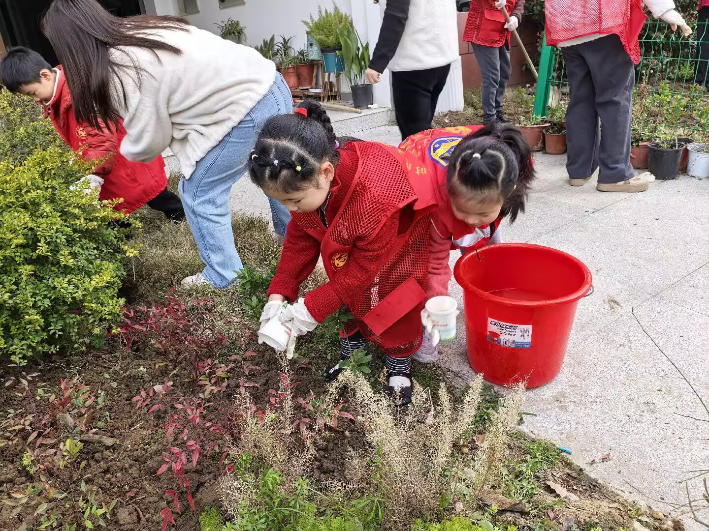 随后,党员和志愿者们还对去年栽种的樱花树进行集中养护,仔细清理树坑周边杂草、进行松土施肥,为树木健康生长保驾护航。辖区幼儿园的小朋友们在老师的带领下,化身“小小护绿员”,提着小水壶、拿着小工具,认真地为新栽的花草和樱花树浇水。孩子们用稚嫩的双手呵护绿色,用童真的行动传递环保理念,成为活动中一道温暖可爱的风景线。
