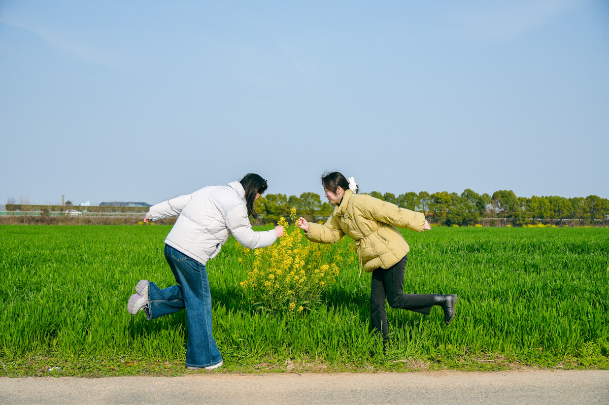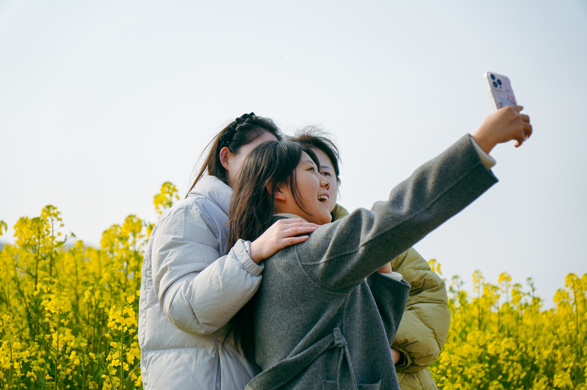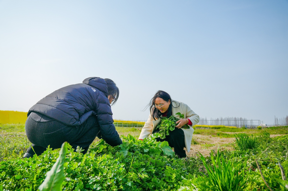 “今天来拍油菜花,刚好再多摘点儿苜蓿菜,我儿子很爱吃!”肖丹蹲在田埂旁,不一会儿就手捧一把嫩绿的苜蓿菜,脸上洋溢着收获的喜悦。闺蜜黄丽则在不远处发现了新“宝藏”,摘了一扎肥硕的野腊菜。短短一刻钟,四个闺蜜搭子都收获满满,随后便沉醉于这片金黄与翠绿交织的花海和麦浪中,尽情凹造型,记录下这美好的春日时光。