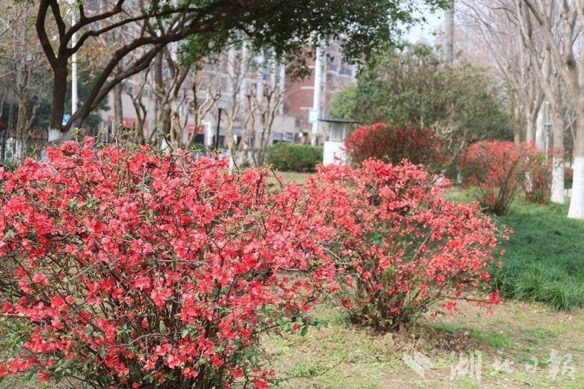 走进南湖幸福湾公园,贴梗海棠正值盛花期。球形树冠上,嫣红花朵紧贴枝干热烈绽放,金黄蕊心点缀其间,无需绿叶便自成景致。海棠与碧水清波相映,移步换景皆是画意。关山公园内,花团锦簇与茅草亭、栈道相融,勾勒出雅致城市花境。“天气晴好,来公园偶遇这片海棠,随手一拍都是大片!”市民艾女士欣喜地说。