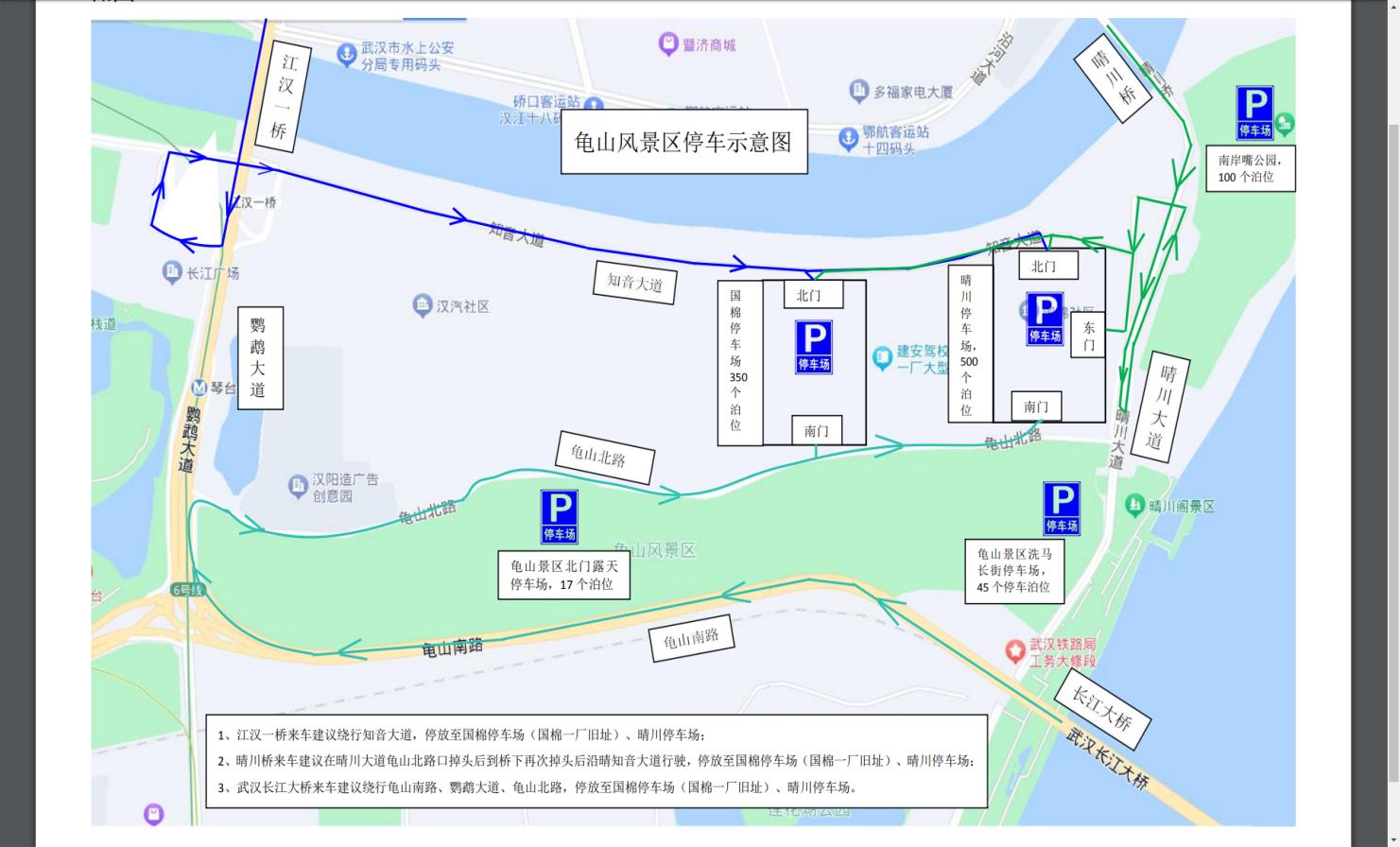 江汉一桥来车:建议绕行知音大道,停放国棉停车场或晴川停车场。