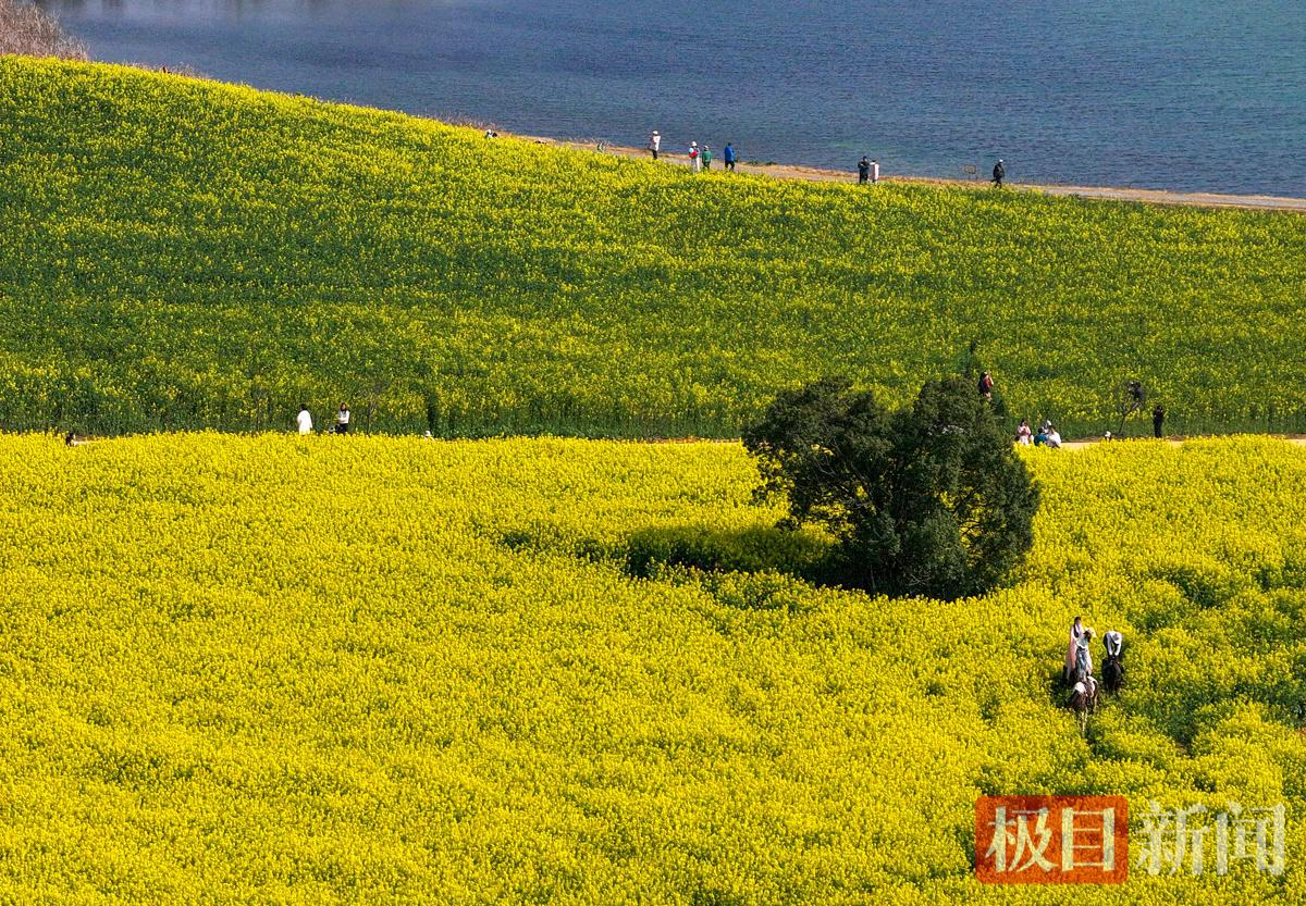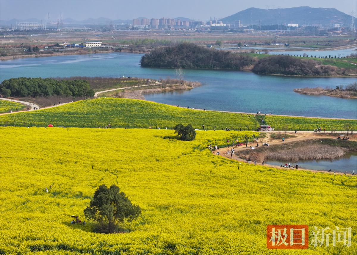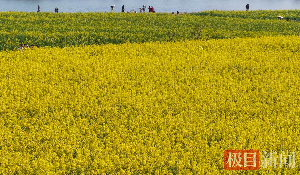 3月12日,新闻记者来到位于武汉经开区军山街新团村的状元湖,200多亩油菜花进入盛放期,放眼望去,一片金黄的花海与碧波荡漾的状元湖交相辉映,构成了一幅绝美的春日画卷。不少市民和游客闻香而动,纷纷前来打卡,记录下这“湖光花色两相宜”的限定美景。