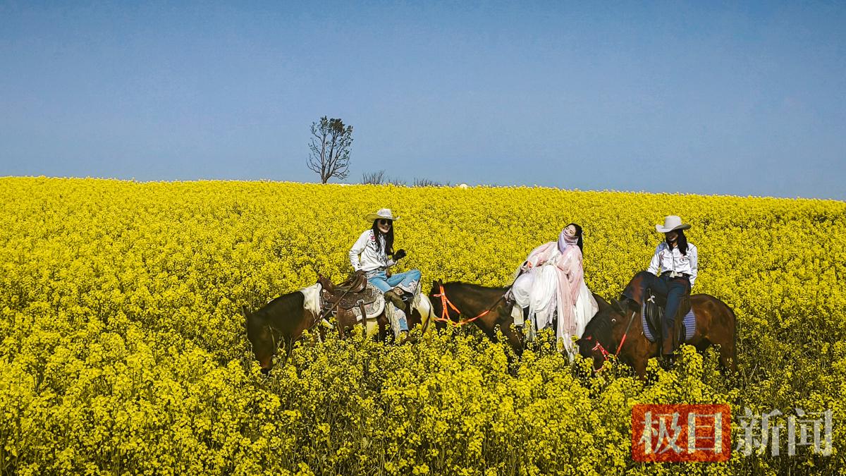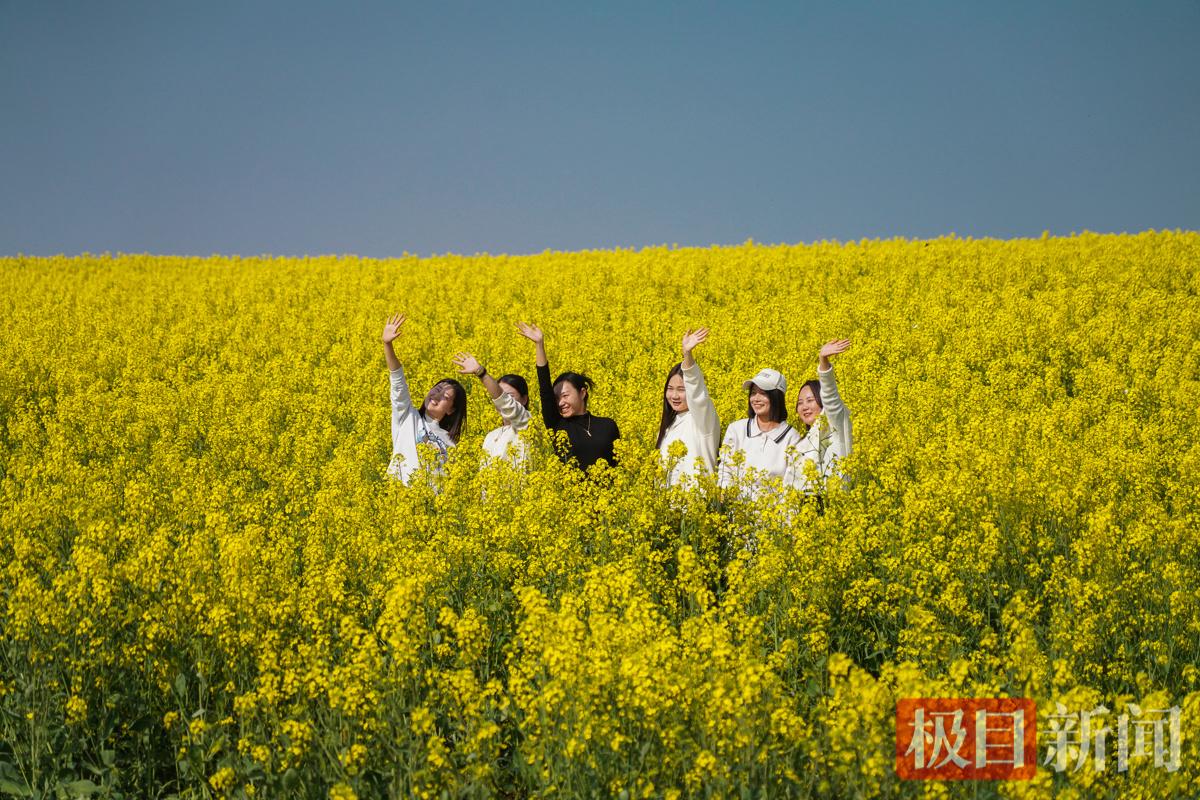 曾凡涛向广大市民游客推荐这片油菜花海,村里的志愿者为广大市民游客提供服务,引导大家免费停车,花期将持续半个月左右,去不了赛里木湖的蓝,就来军山的油菜田赴一场金黄的约。