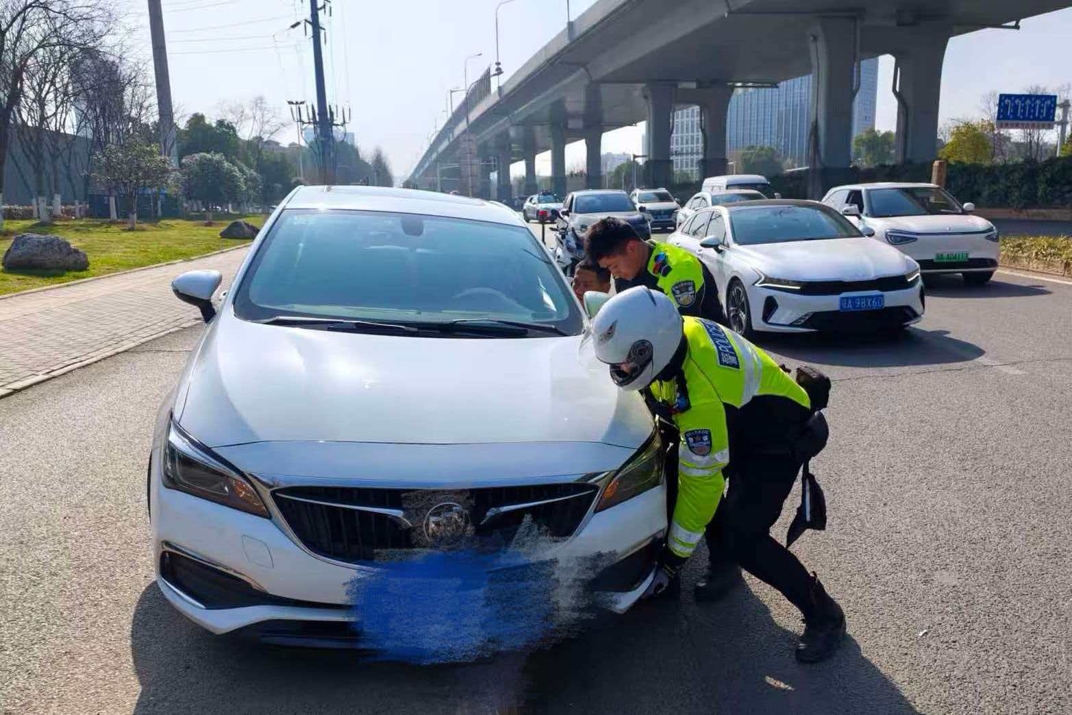 “师傅,怎么了?需要帮助吗?”两人迅速停好摩托车,上前询问。黄女士像是见到了救星:“警察同志,我车子卡住了,不敢动,一动就怕把底盘刮坏了!”