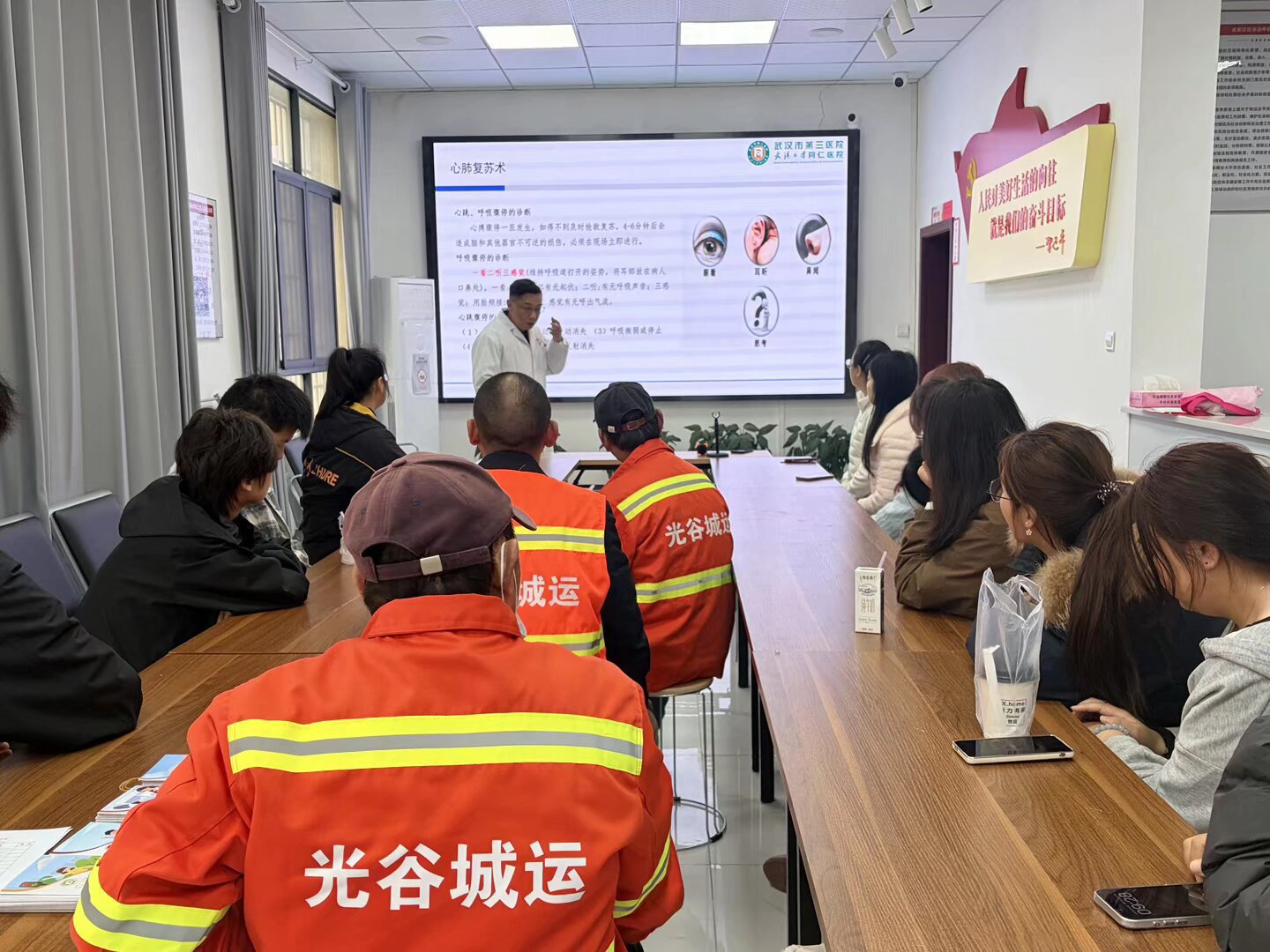 活动伊始,武汉市第三医院急诊科叶主任为在场的户外工作者及社区志愿者带来了一场专业、实用的急救技能培训。培训聚焦心肺复苏、创伤止血、中暑应对等户外常见突发状况,通过理论讲解与模拟操作相结合的方式,切实提升了大家在紧急情况下的自救与互救能力,为户外奔波增添了一道坚实的安全屏障。