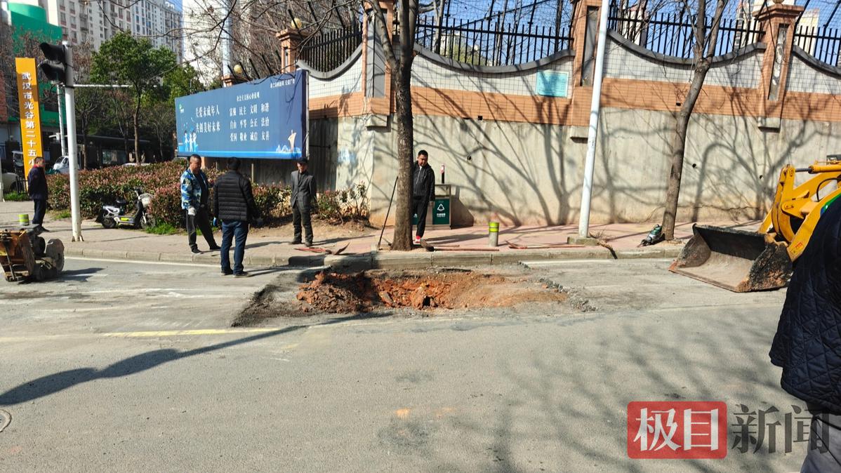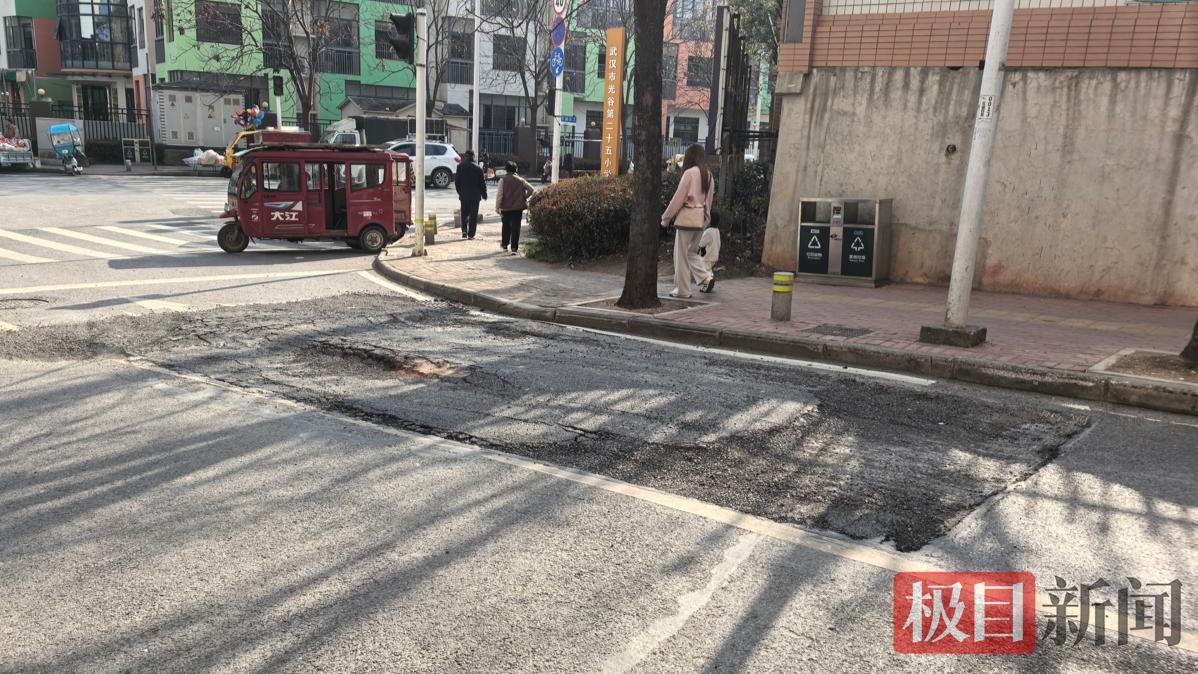 3月13日,新闻记者现场探访发现,该破损路面位于花福街与花福四巷交汇处的十字路口,紧邻光谷第八初级中学,光谷第二十五小学。