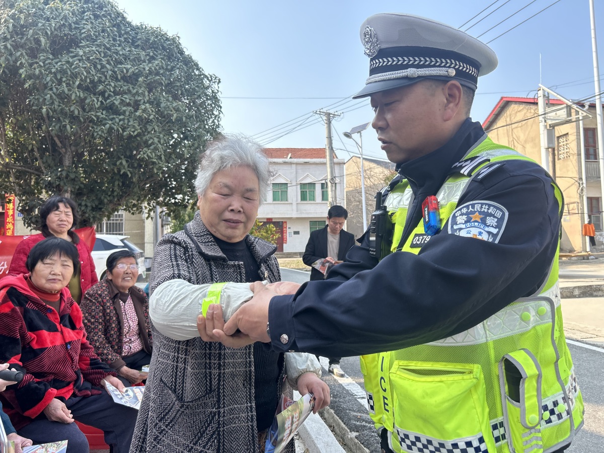 围绕“一盔一带”交通安全主题,武汉市公安局蔡甸区分局交通管理大队四中队副中队长胡阮俊与村民们围坐一圈,像邻里闲聊一样,从日常出行的小事慢慢聊开。“大姐,骑电动自行车接送孩子,安全头盔可得戴稳了,特别是孩子的小头盔,也得戴好了。”随后,民警给村民发放宣传资料,耐心解答大家关于交通规则的各类疑问,并用朴实的方言,结合本地真实案例,深入浅出地讲解农用车载人、不戴头盔、横穿马路等常见交通陋习的危害。考虑到农村夜间出行能见度低的实际问题,民警还特意准备了反光手环现场分发给村民,并示范佩戴方法:“晚上出门戴上它,车灯一照就亮,能让司机早早看到咱们,多一份安全提醒。”