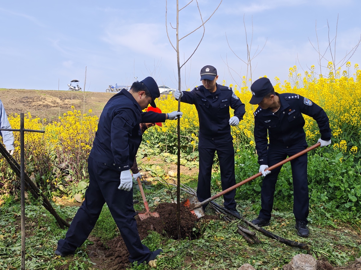 活动中,民警与渔政人员深入沿江村落,走村入户开展禁渔普法、水上安全、反诈防骗等宣传,倾听群众诉求、解答法律疑问。不仅如此,民警还与堤防工作人员携手开展志愿植树活动。大家挥锹铲土、扶苗填坑、踩实浇水,为护江林添一抹新绿。