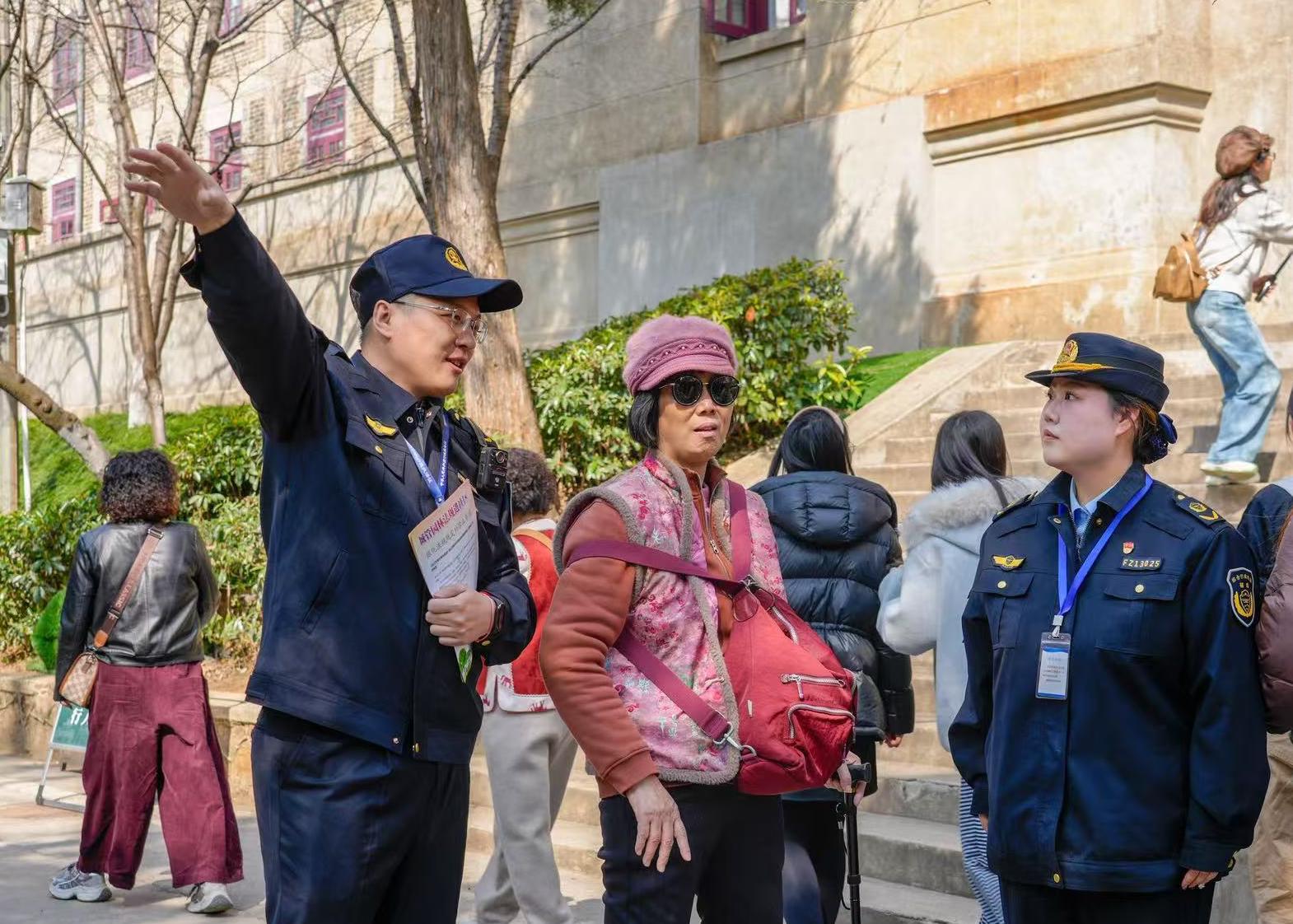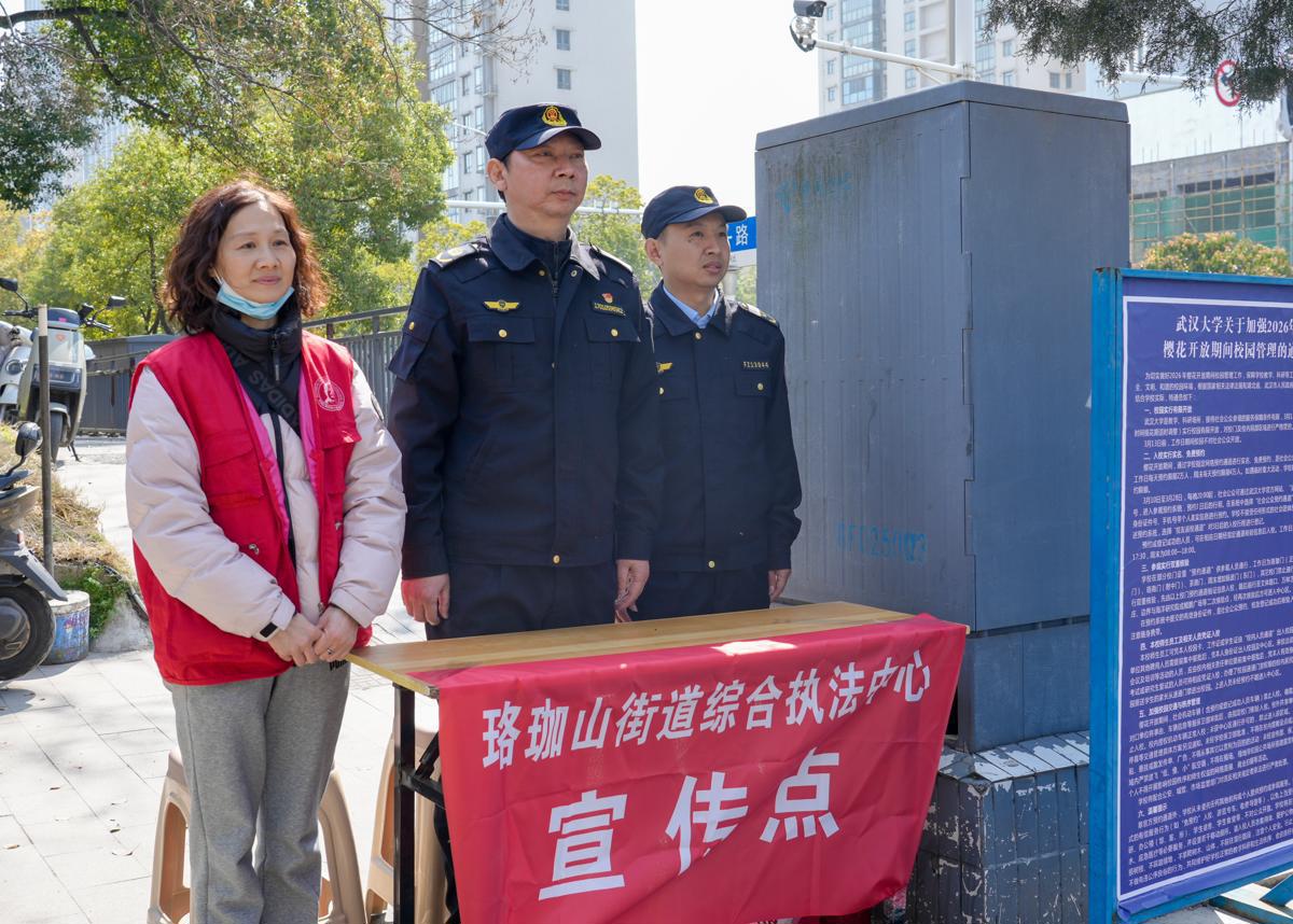 珞珈门作为重要的赏樱入口,人流量大、情况复杂。珞珈山街道执法中心提前与珞南街道综合执法中心紧密联合,开展跨区联动,共同组建了一支6余人的专项巡查小队。执法人员严格管控,确保入口周边无小摊小贩占道经营,维护了入口的畅通与整洁。同时,在珞珈门设立了流动城管工作室,这一创新举措为游客提供了更为便捷的服务。
