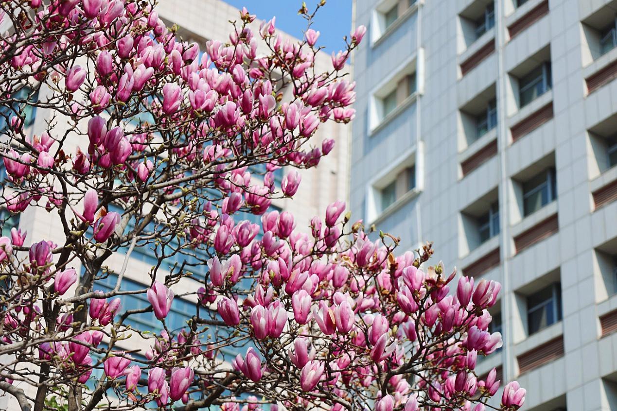 无需远足寻春,城市街头便是盛景。文治街、团结大道部分路段沿线,玉兰花迎来盛花期,一树树如云似雪,将街道装点成浪漫花廊。驾车行驶其间,春风伴着淡淡花香扑入车窗,平凡的通勤路变成春日漫游之旅。华中科技大学校园内,玉兰也正值盛放,与书香校园相映成趣。目前玉兰最佳观赏期尚余一周左右。