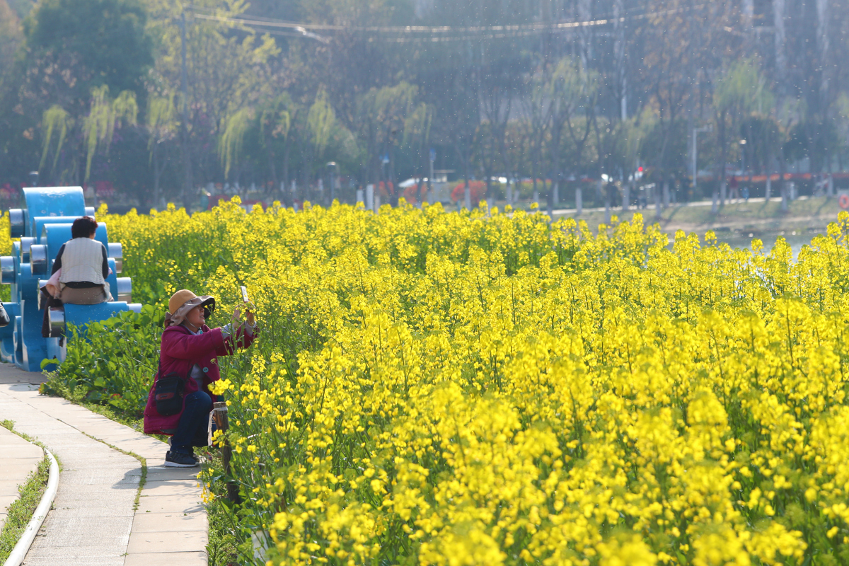 走进南湖幸福湾公园东侧,3000多平方米的油菜花田已展露风姿。金色的花海与波光粼粼的南湖交相辉映,微风拂过,花浪此起彼伏,清甜花香沁人心脾。市民游客或驻足浅笑,或缓步穿行,快门声此起彼伏。“春天到了,油菜花都开了,心情特别舒爽。”家住南湖周边的商女士笑着说。这份春日浪漫正在多点开花——杨春湖公园6000余平方米的油菜花也已渐入佳境,华中农业大学的试验田里,油菜花同样金黄一片,成为学子们课余打卡的热门去处。