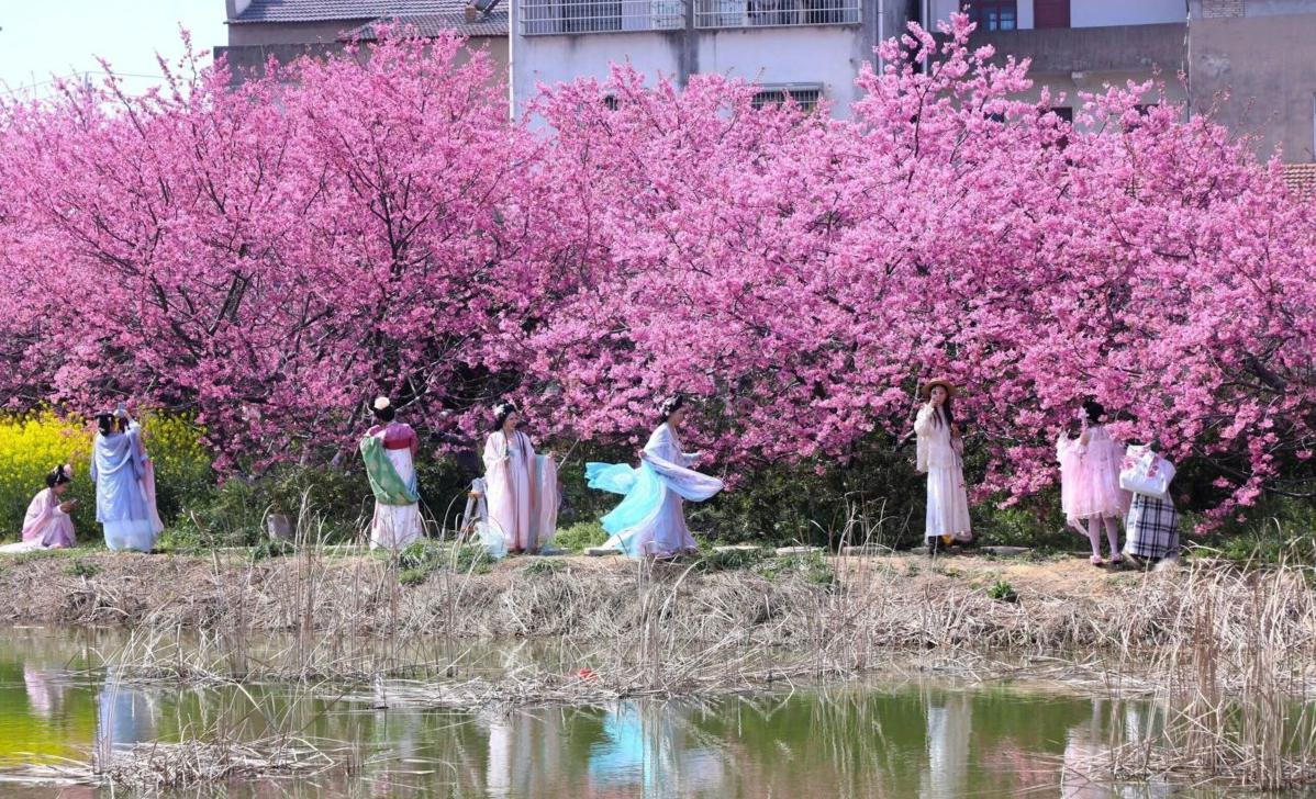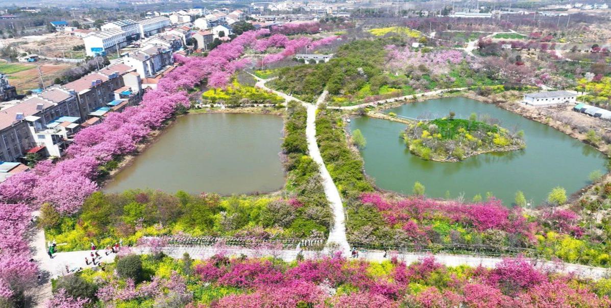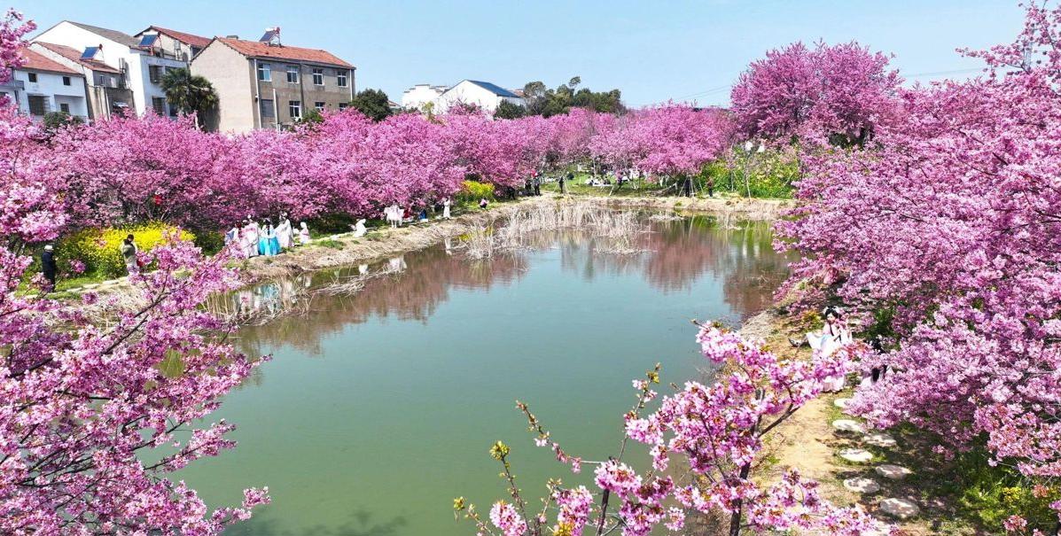 长江新区仓埠街道周铺村楚风樱海生态园迎来烂漫春光。园内游人如织,白樱似雪,簇簇绽放;粉樱如云,绯红明媚。晴日当空,漫天花瓣轻舞飞扬,将整片天空晕染成温柔的粉色薄纱,一步一景皆是醉人的春日盛景。