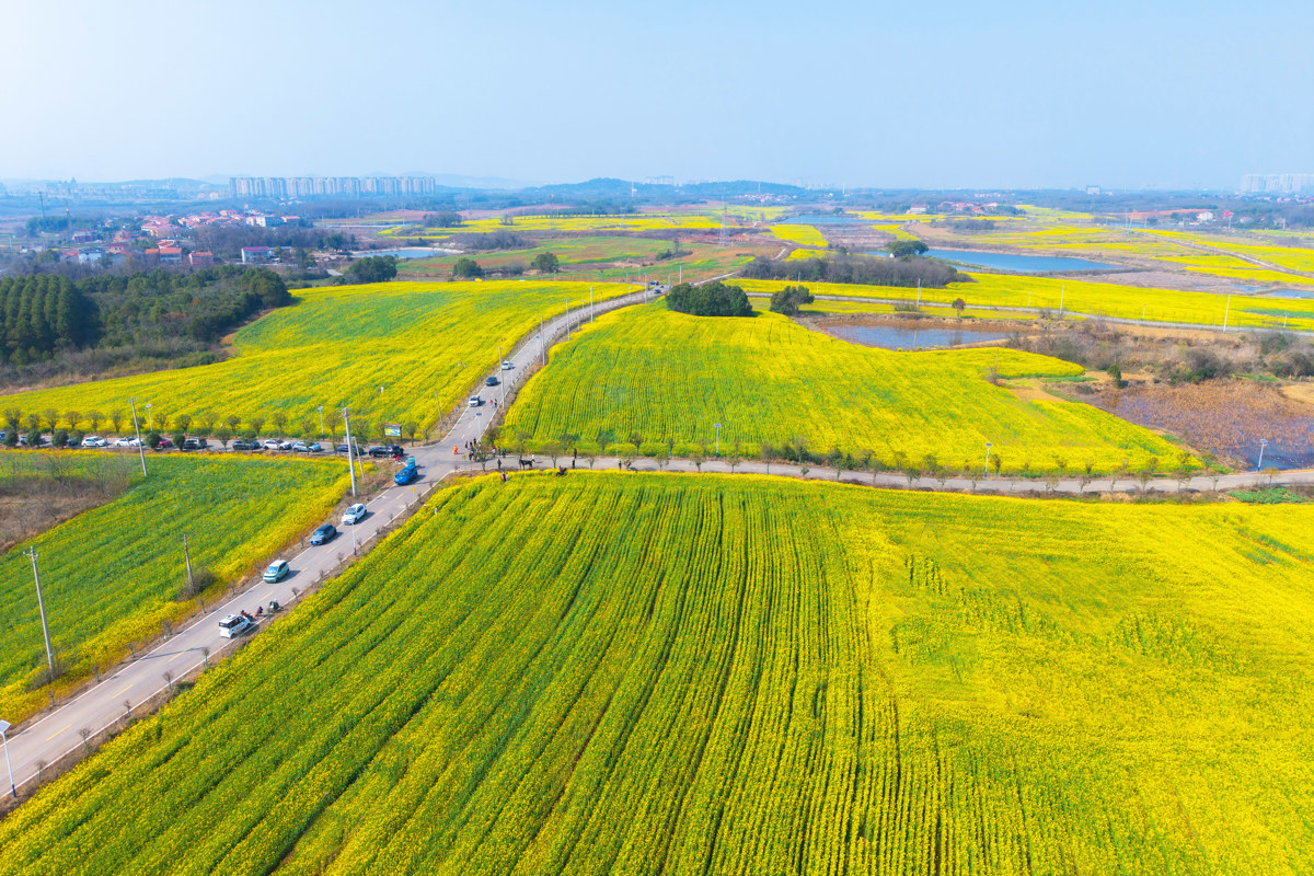 洪山区南湖幸福湾公园东侧,3000多平方米的油菜花田已展露风姿。金色的花海与波光粼粼的南湖交相辉映,微风拂过,花浪此起彼伏,清甜花香沁人心脾。