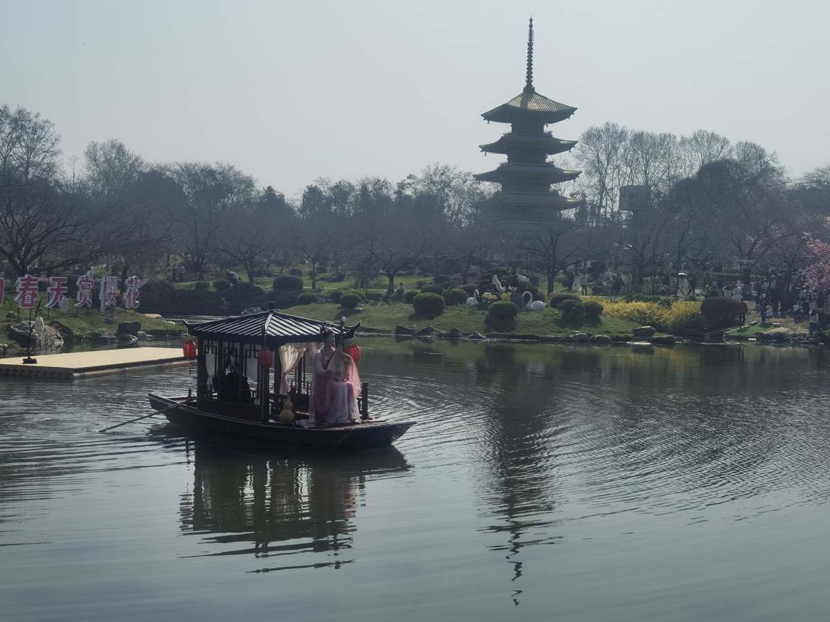 水面的游船上,有汉服表演,樱花音乐节吸引游客驻足观看。