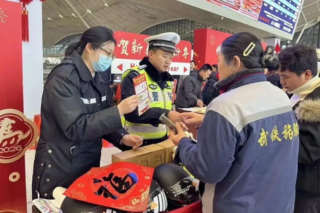 ▲武汉交警在汉口火车站向过往旅客发放交通安全手册
