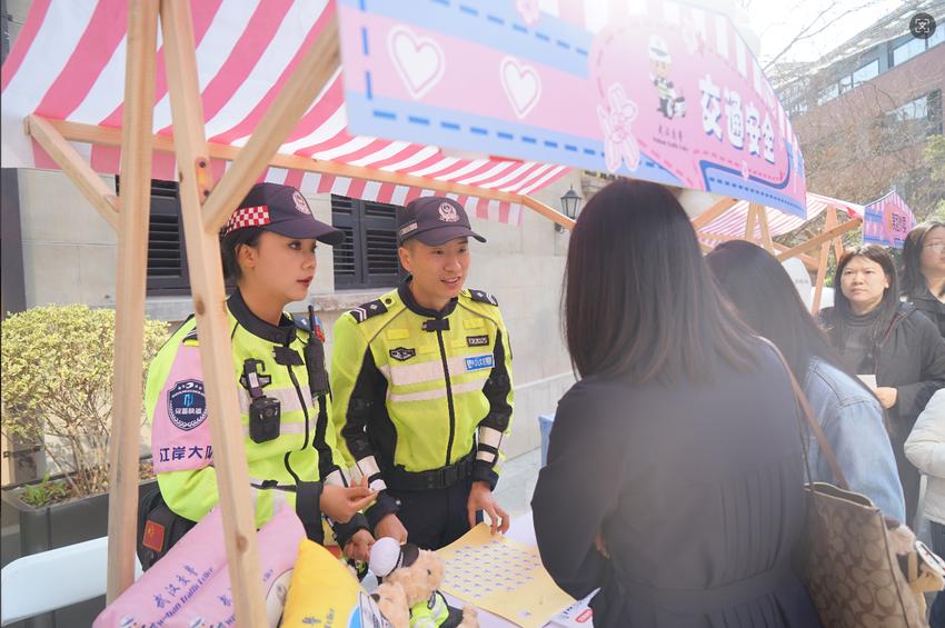 “在设有禁停标识的路段停车,处罚标准是什么?”“罚款100元!”江岸区交通管理大队的摊位前,欢笑声此起彼伏。“没错,行车道路有限。”交通大队汉警快骑队员周海、袁欣珮将交通安全知识有奖问答与游戏互动巧妙结合,让市民在玩乐中学习交通法规,集章打卡中让安全出行的理念随声音传递。