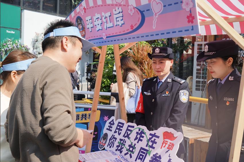 走进广场,4个打卡区域,18个宣传展台有序排开,市民群众纷纷上前与工作人员热情互动,最引人注目的是武汉市公安局江岸区分局刑侦大队反电诈中心与分局网安大队联合设立的反诈宣传区。图文并茂的反诈宣传展板整齐排列,冒充公检法、养老诈骗、网络刷单等常见骗局的作案手法被一一解析,群众驻足细看,不时发出惊叹:“原来骗子的套路这么多!”反诈中心民警吴冬妮、熊晚风向群众分发反诈宣传册。“要把反诈知识记在心里,带回家中!”