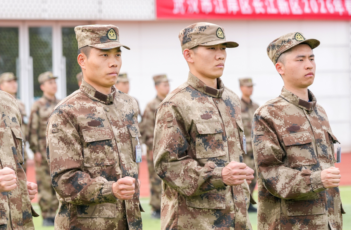 日前,武汉市2026年春季预定新兵正在进行紧张的役前教育中。在蔡甸野战国防园训练场上,硚口区两名二次入伍青年梁林飞、王以立也正在以饱满状态参加训练和接受教育,为重返军营,再赴强军使命而准备着。