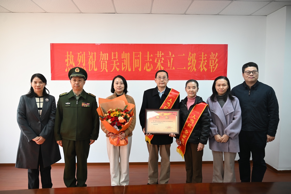 荣立二级表彰的吴凯同志是市军休四中心军休干部吴觉生的儿子。上午,工作人员为功臣家属佩戴绶带,敬献鲜花,并详细询问了吴觉生的身体状况和生活情况,感谢他为国家培养了一位优秀的人才,为国防和军队建设作出的突出贡献。