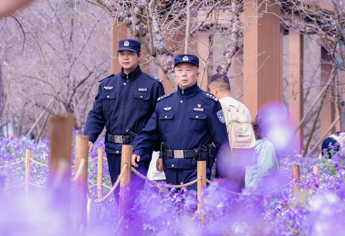 3月14日恰逢周六,东湖风景区的各类花卉竞相争艳,吸引了来自全国各地的数万名游客踏青赏花。在这如织的人流中,那一抹穿梭往来的“藏蓝”身影,成了花海里别样的“警”色。