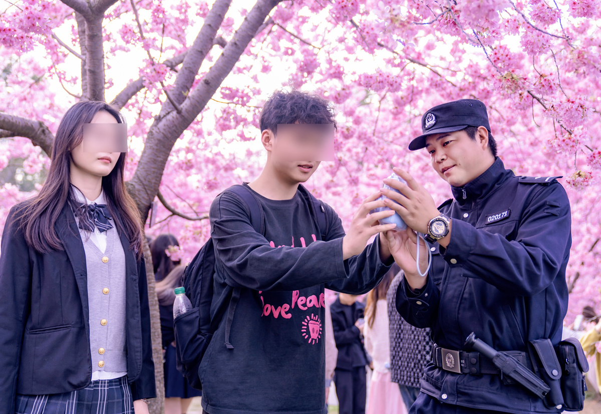 当天9时许,东湖樱花园还未迎来客流最高峰,武汉市公安局东湖生态旅游风景区磨山派出所民警胡德峰与辅警冯靓已经开始了当天的第一次园区巡逻。“大家往里边走,注意脚下台阶,照顾好身边的老人和小孩。”胡德峰手持扩音器,声音温和而有力。虽然开园不久,但“曲院樱艳”旁的古风亭台边已围满了拍照的游客,冯靓紧跟在胡德峰身后,目光敏锐地扫视着四周的人群,不时提醒着把背包甩在身后的年轻女孩注意财物安全。