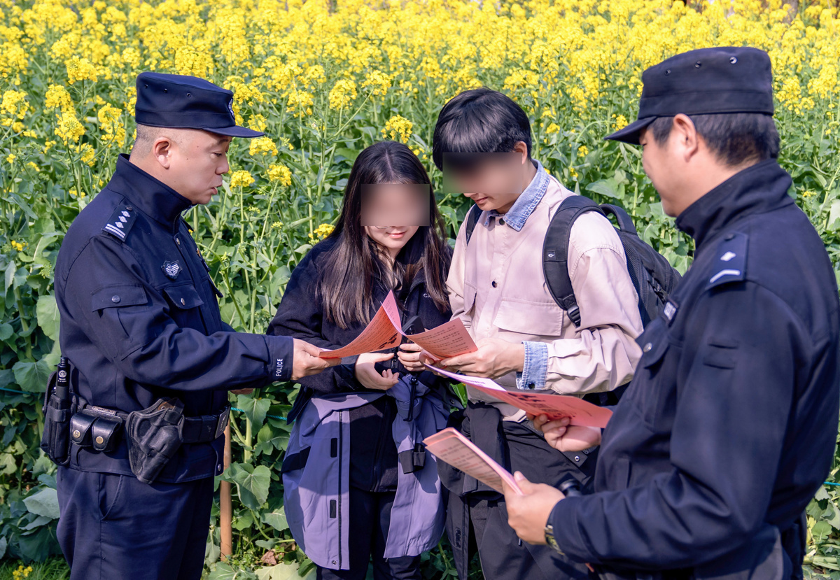 “大家出门赏花是好心情,但可别让骗子坏了兴致。”行至一片油菜花海旁,看到许多游客在花前拍照留念,胡德峰停下脚步,从随身携带包里掏出一沓反诈宣传单,递给拍完照的游客们,笑着说道:“赏花季旅游高峰也是电诈分子活跃的时候,特别是机票退改签、虚假旅游攻略链接这些,一定要留个心眼。”