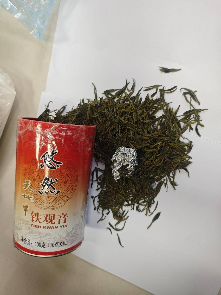 打开层层包装,里面是一个看似普通的茶叶罐。然而,当民警拧开罐盖时,倒出的并非只有茶叶,还有一枚用锡纸严密包裹的黄金首饰。经现场称重,这些黄金重达20克。