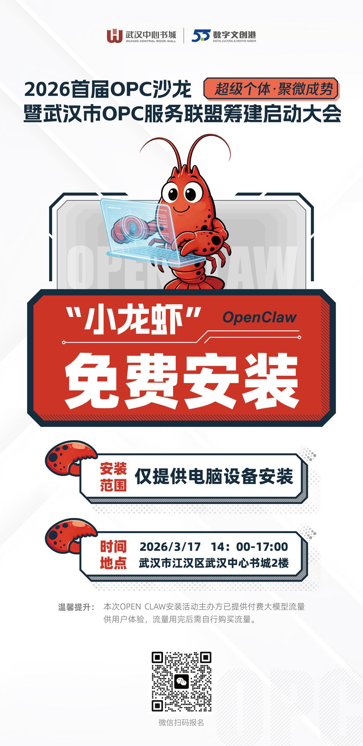答案就在3月17日!2026首届OPC沙龙暨武汉市OPC服务联盟筹建启动大会将在武汉中心书城正式举行,现场将提供OpenClaw(俗称“小龙虾”)免费安装服务,感兴趣的企业及个人可通过微信扫码报名参与,解锁这场AI+机器人的科技盛宴。
