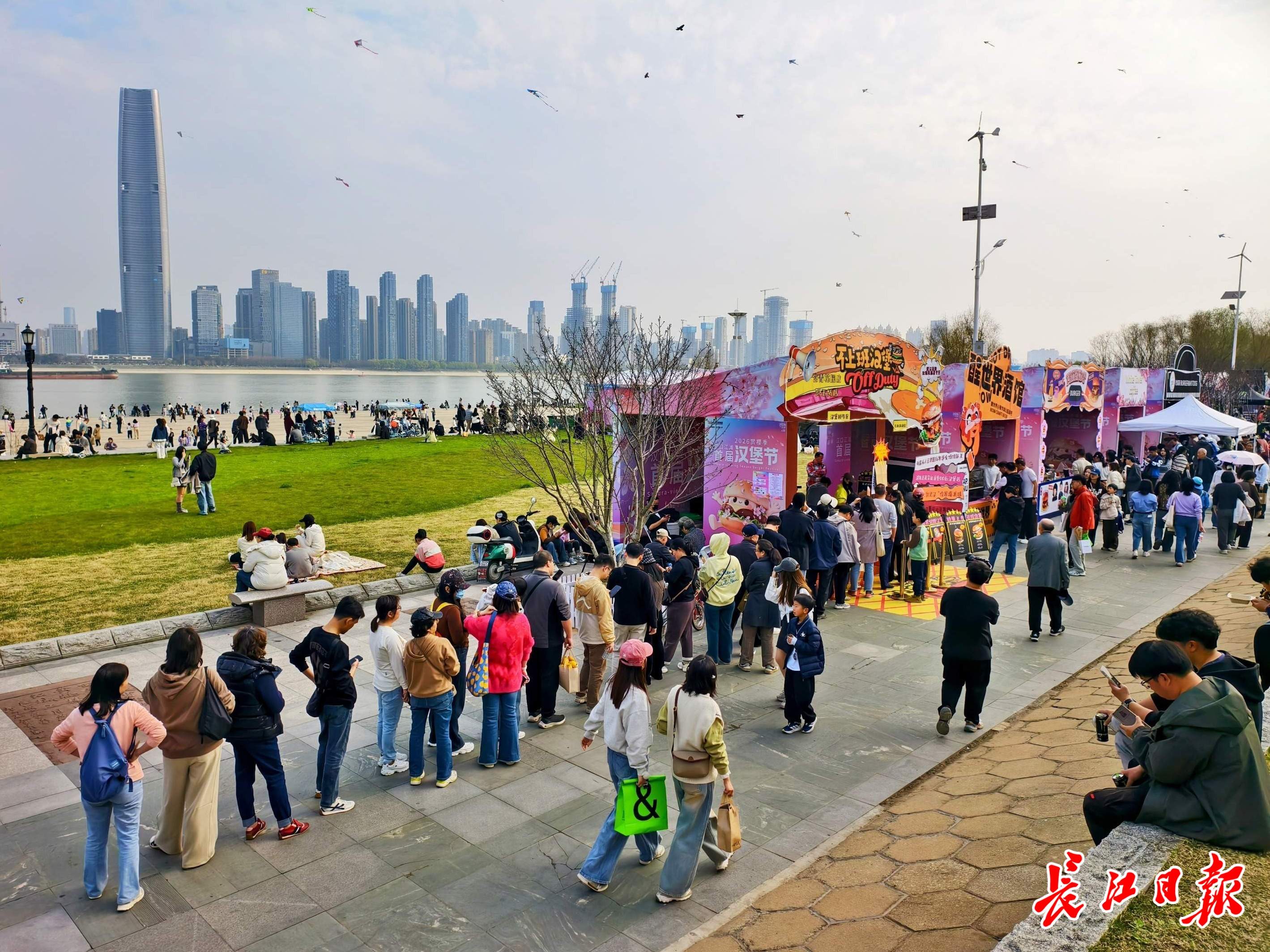 3月14日,汉口江滩三阳广场,汉堡节开了。十九家武汉本土手作汉堡店挤在樱花树下,烟火气把春天熏出了肉香。不到中午十二点,人已经走不动道,有的队要排四十分钟。长沙来的小陈和同学举着汉堡找角度,背后是粉白的樱花。“一边樱花一边汉堡,春风配美食,太开心了!”她说。