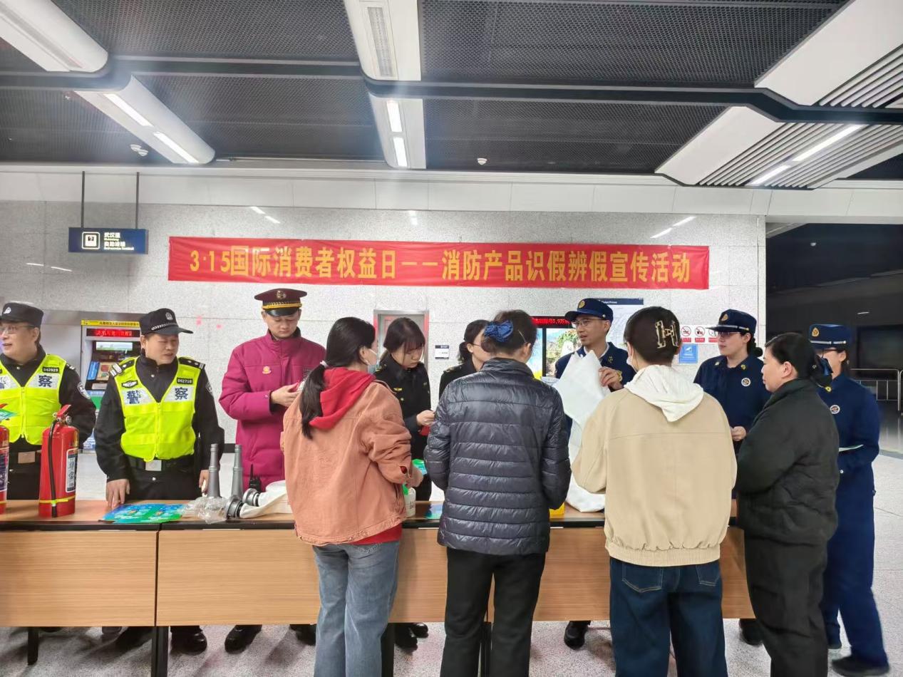为进一步规范武汉轨道交通领域消防产品使用管理,提升市民与地铁从业人员识假辨假能力,筑牢地下空间消防安全防线。轨道消防救援大队联合市场监管、轨道公安及地铁运营单位组成“四色联盟”,在重点地铁车站开展联动宣传。活动现场,四部门工作人员协同发力,通过实物展示、真假对比、现场讲解、互动答疑等形式,向过往乘客普及消防产品安全知识。针对车站常用的干粉灭火器、应急照明灯具、过滤器式自救呼吸器等常见消防产品,工作人员重点讲解看标识、查3C认证、核检测报告、验外观质量的实用方法,直观展示假冒伪劣产品的典型特征,提醒市民警惕低价劣质消防产品带来的安全隐患。