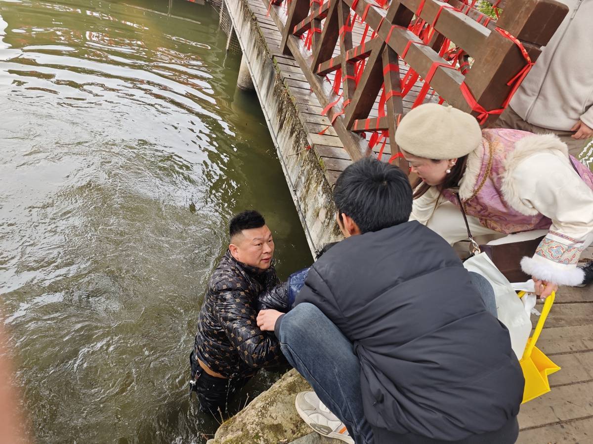 因救援及时,孩子只是受到了惊吓,身体并无大碍。此时的陈江浑身湿透,在寒风中打着寒战。面对随后赶来的孩子家属,他婉拒了感谢,悄悄带着家人离开现场,这一幕被热心群众用手机记录了下来。经过景区和家属的多方寻找,这位不留名的救人英雄终于被找到。