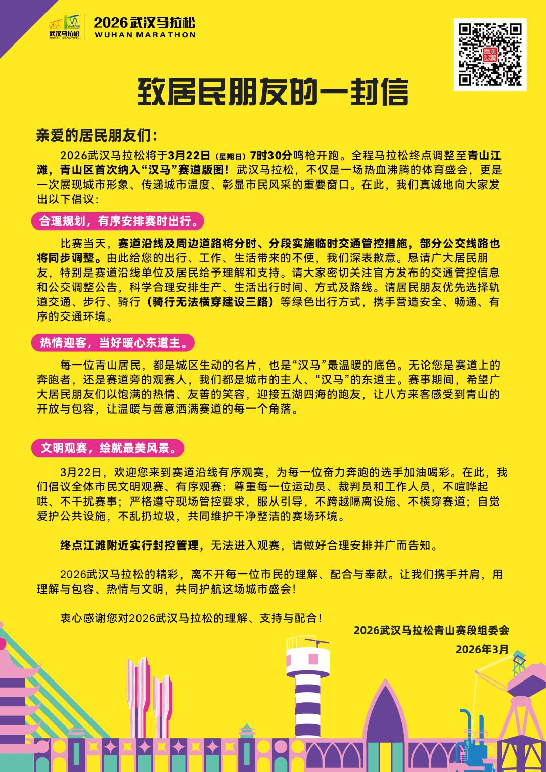 2026武汉马拉松将于3月22日(星期日)7时30分鸣枪开跑。全程马拉松终点调整至青山江滩,青山区首次纳入“汉马”赛道版图!武汉马拉松,不仅是一场热血沸腾的体育盛会,更是一次展现城市形象、传递城市温度、彰显市民风采的重要窗口。在此,我们真诚地向大家发出以下倡议: