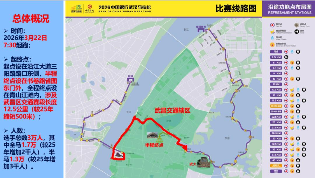 取消13公里健康跑及首义广场保障点位,参赛选手通过长江大桥后,将从黄鹤楼南路右转前往彭刘杨路、临江大道。
